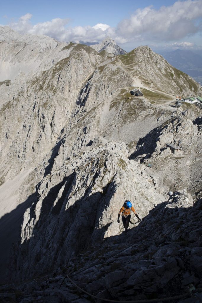 Es hat schon seinen Grund, warum diese Via Ferrata auch unter dem Namen „Panoramaklettersteig“ bekannt ist: Auf der einen Seite das urbane Innsbruck, auf der anderen Seite das wilde Karwendel, in der Mitte man selbst. Von der Seegrube bis hinüber zum Frau-Hitt-Sattel – der Innsbrucker Klettersteig bietet eine Gratüberschreitung der Sonderklasse. Wem der gesamte Steig zu lang ist, der kann auch in der Mitte über den Langen Sattel wieder zurück auf die Höttinger Alm absteigen. Der Kaspressknödel dort ist obligatorisch!
