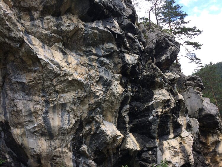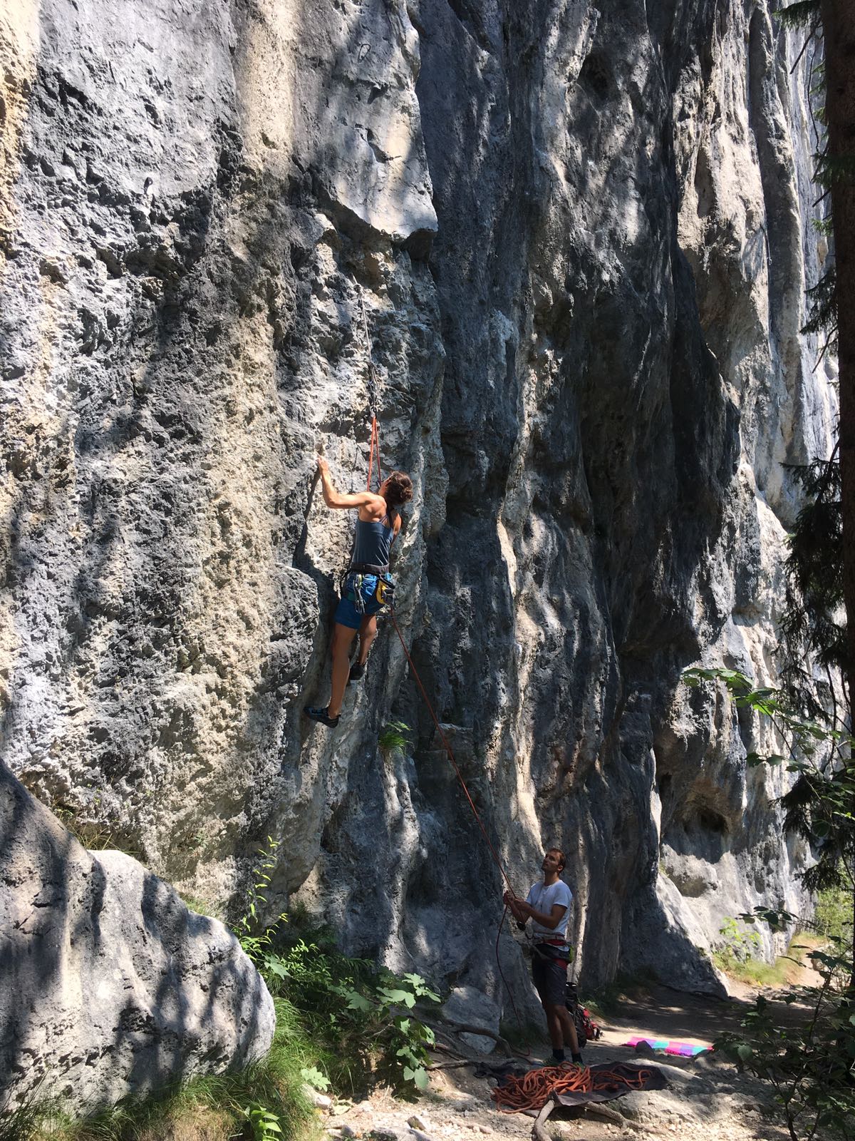 Der Fels: griffiger Wettersteinkalk, wie er normalerweise nur im Hochgebirge vorkommt – hier liegt er ganz irdisch in Talnähe: Lediglich 20 Minuten trennen Kletterer, vom Parkplatz aus betrachtet, von der Wand. Über 180 Routen verteilt in 11 Sektoren laden zum Felstanz. Standardtanz und ein bisschen Hin- und Hergeschiebe ist hier aber nicht. Sprich: Richtig Spaß macht die „Mauer“, wer im 8. Franzosengrad aufwärts unterwegs ist. Und so kann man dann auch getrost in den „Watschenmann“ (7b+) einsteigen, ohne größere Blessuren davon tragen zu müssen.
