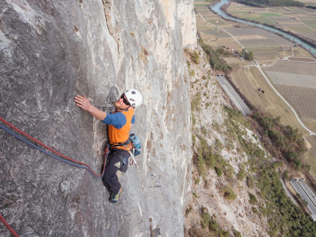 Die Routen hier tragen schon so schöne Namen, dass man sie einfach klettern muss: „Strada del Sole“ (7), „Utopia“ (8-) oder „Träumerei“ (7-). Nichts anderes ist hier fast jeder Meter, kurzer Zustieg, gemütlicher Abstieg, geniales Panorama. Dass die Routen hier auch noch fast sportklettermäßig eingebohrt sind, erklärt die Popularität dieser imposanten Wand.