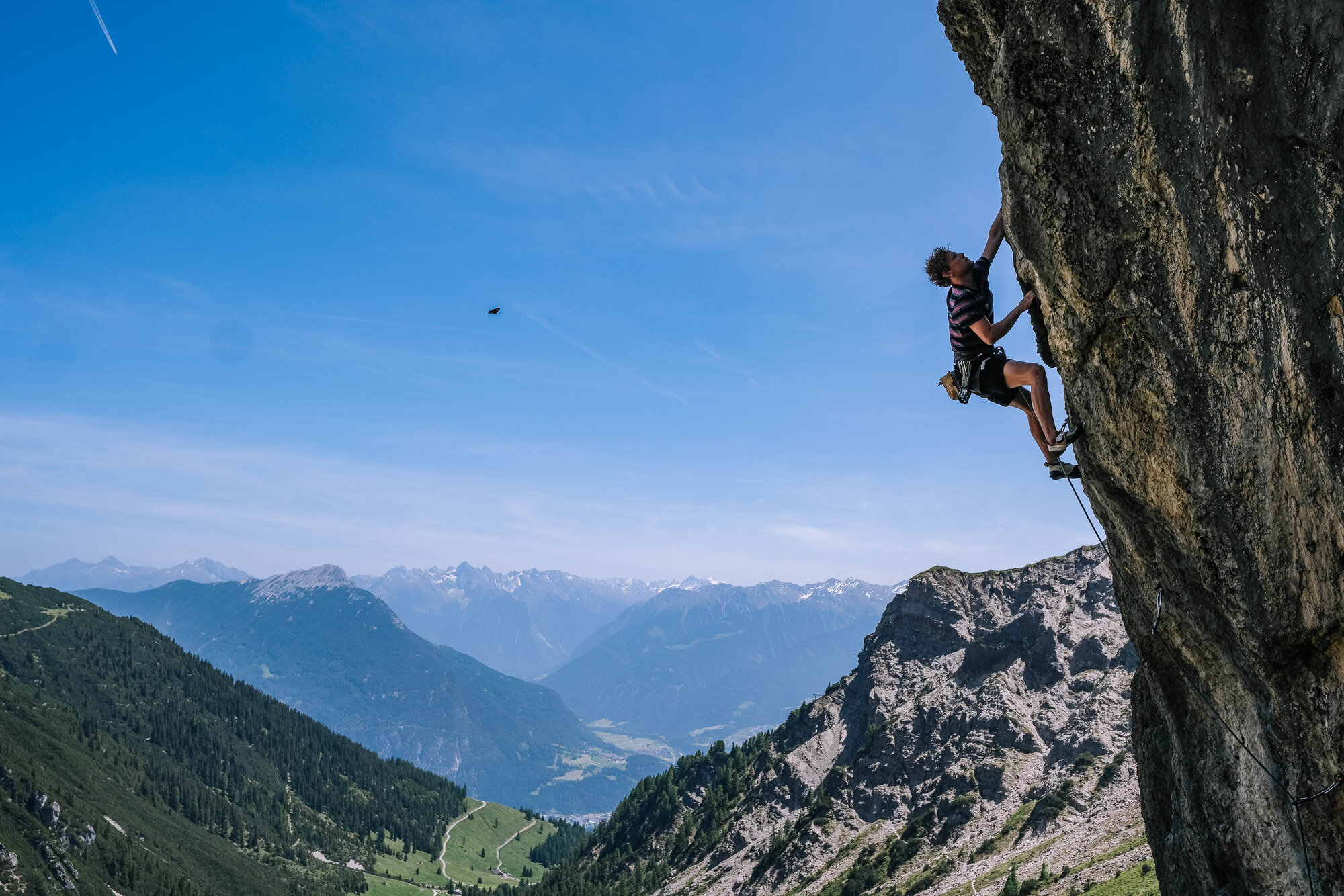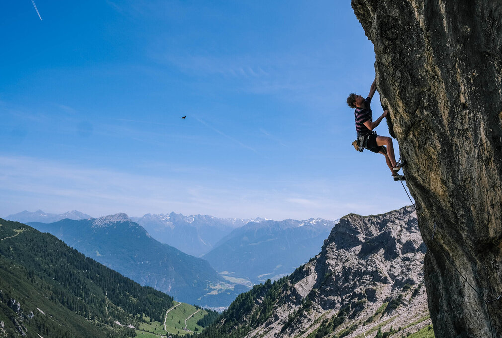 Abhängen mit Aussicht: Daniel Felsner im Sektor Eisenhut. „Scharf, aber genial!“ Insgesamt gibt es 10 Klettergärten in traumhaft schönem, alpinem Ambiente oberhalb der bewirtschafteten Muttekopfhütte.