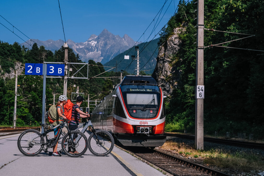 Puristisch ist unser Anreisetag: Wir kommen mit möglichst geringem Fußabdruck hin zum Fels – ohne Auto, dafür mit dem Zug, dem Rad, unseren Füßen, in genau dieser Reihenfolge. eBike & Climb ist längst zu einem eigenen Genre in Tirols Kletterszene geworden, das Ecopoint-Klettern das neue Rotpunkt. Meist sind es hochgelegene alpine Mehrseillängen, bei denen der mitunter lange Zustieg mit schwerem Rucksack sehr gern motorisiert erleichtert wird. Das schont die Knie beim Abstieg und spart Energiereserven für die entscheidenden Züge an der Wand.