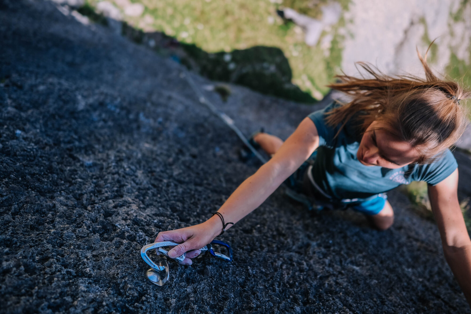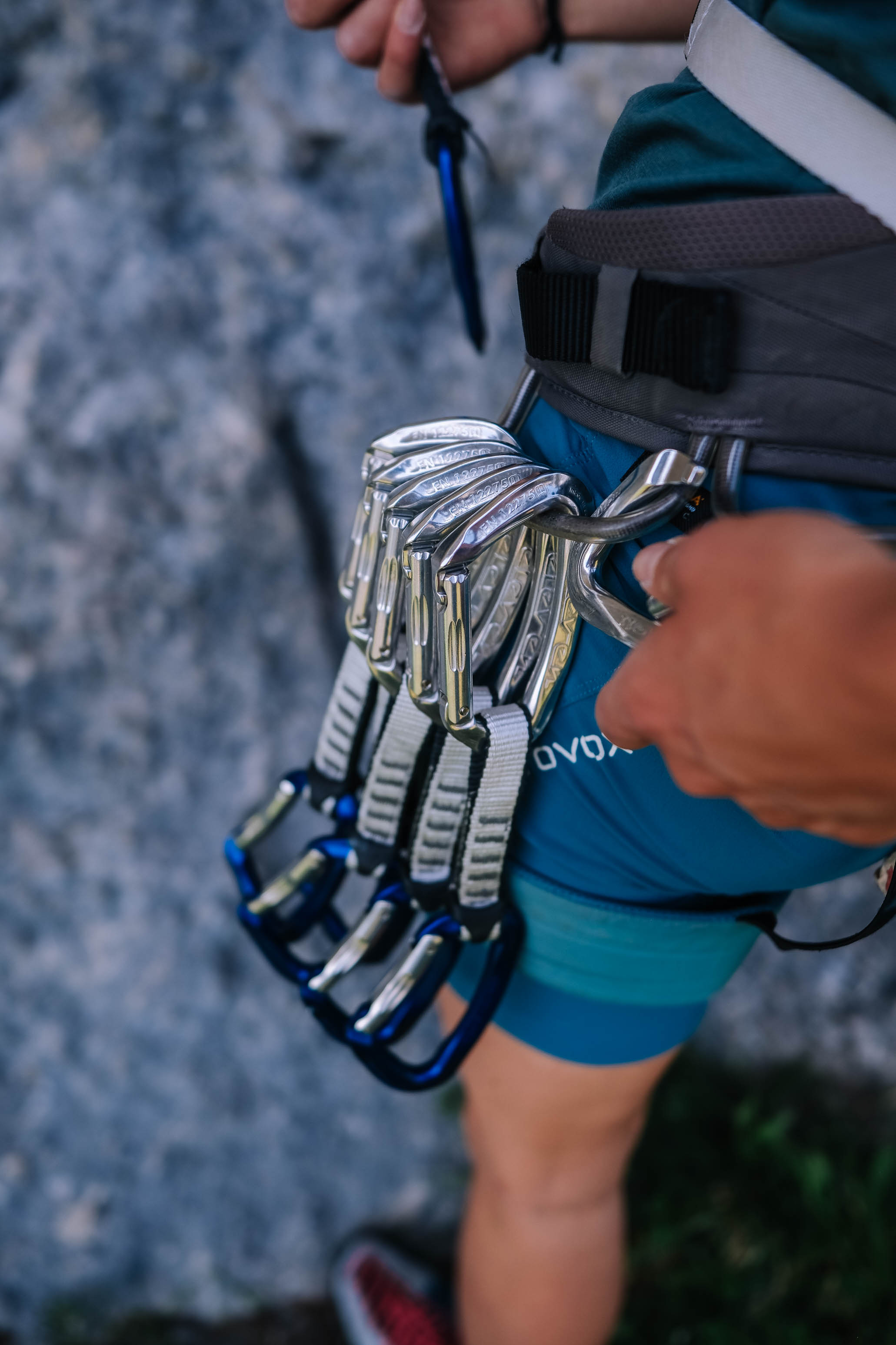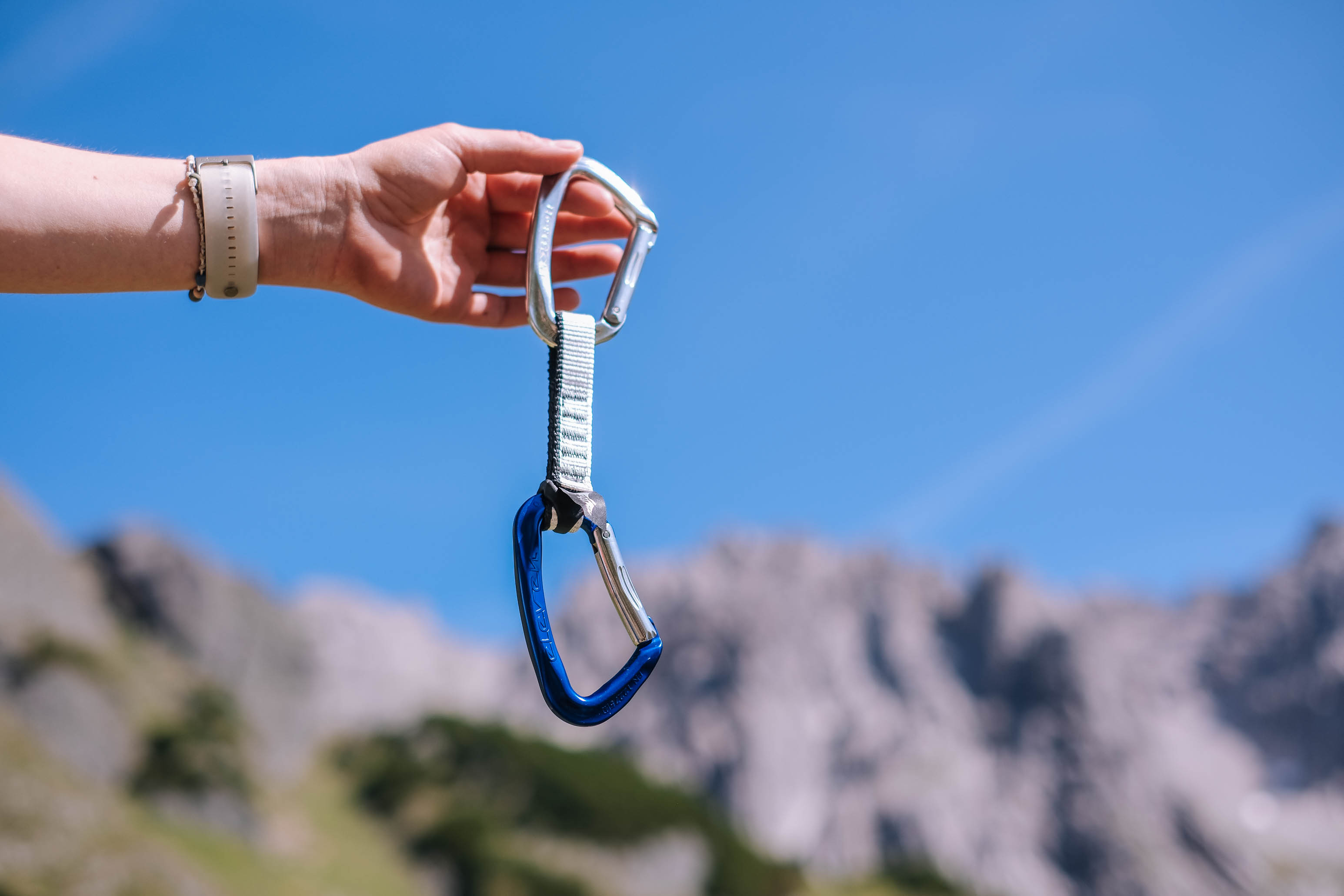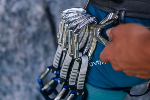 An ihrem Klettergurt baumeln die neuen ELEVEN Raw Express-Schlingen von Austrialpin - schlichte Eleganz in puristischer Farbgebung. Perfekt passen sie zur minimalistischen Philosophie des Tages. Kurze Lieferwege in der Herstellung haben auch diese Express-Schlingen: Made in Tirol, genau wie die Bergwelt, in der sie heute zum Einsatz kommen. Der sparsame Einsatz von Eloxal gewährleistet dabei die Unterscheidbarkeit der Karabiner und setzt dennoch auf Ressourcenschonung - ein Detail, das zur nachhaltigen Anreise per eBike perfekt passt.
