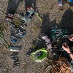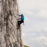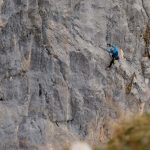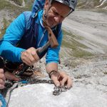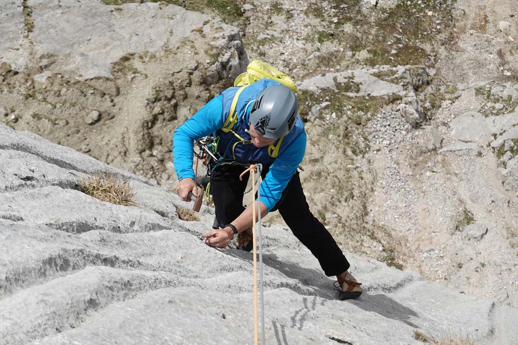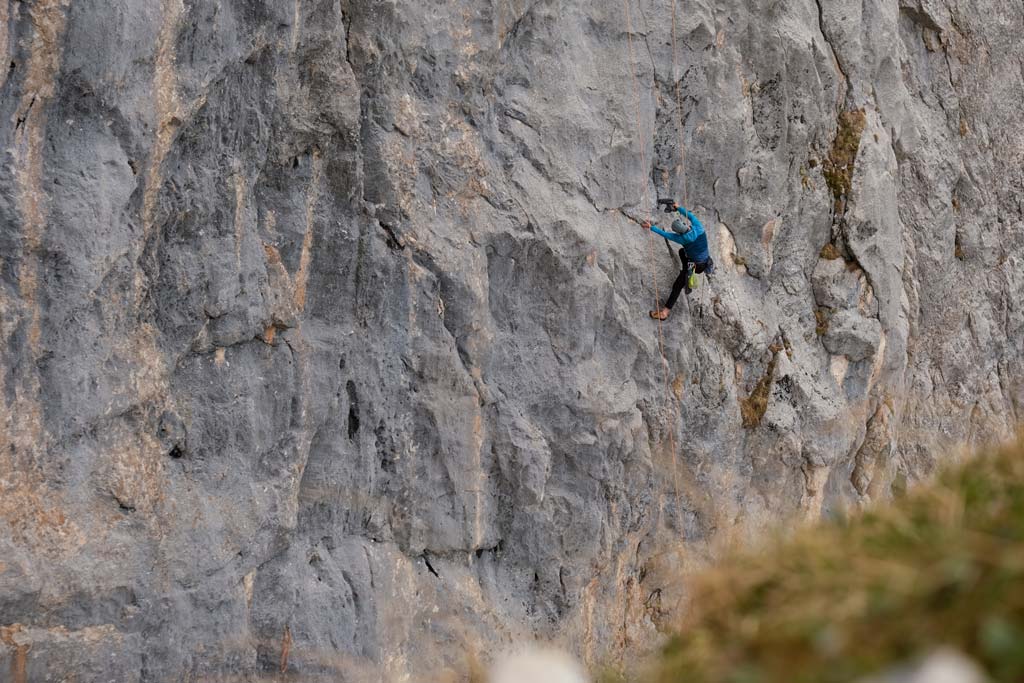 Aber immer nur recht kurz, 25 Sekunden später bestimmt dann wieder der Wind die Geräuschkulisse. Es folgen ein paar rhythmische Hammerschläge, um den Expressanker in das frisch gebohrte Loch zu hämmern, ein paar Umdrehungen mit dem Schraubenschlüssel und fertig ist der Bohrhaken. „So Luis, der hält mal für die nächsten 100 Jahre“, meint Thomas – und seilt sich ein paar Meter tiefer, um die perfekte Stelle für den nächsten seiner Art zu finden.