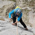 - Abstieg: Mit Doppelseil über die Route abseilen. Das Abseilen ist auch mit einem 70 Meter Einfachseil möglich.