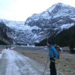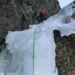 Jochen und ich starteten um 4 Uhr früh von Lüsens. Bereits beim flachen und voll vereisten Weg bis zur Abzweigung wären manchmal die Steigeisen von Vorteil gewesen. Nach der Längenfelder Alm Richtung Westfahlenhaus ging es dann links über Blockgelände mühsam bis zum Einstieg. Knapp drei Stunden waren bereits vergangen und wir adjustierten uns für den anspruchsvolleren Weiterweg. Seillänge um Seillänge ging es im Eisgully recht flott nach oben, bis wir die Schlüsselseillänge erreichten. Eine Seilschaft mühte sich gerade in dieser ab und wir konnten uns eine kurze Verschnaufpause gönnen. Zwei fixe Sicherungspunkte waren nicht gerade üppig für die knapp 30 m, aber es gibt ja noch mobile Sicherungsmittel.