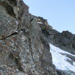 Wichtig war es, jetzt die Pickel exakt zu verankern um dann mit einem beherzten Zug die weiteren Hooks anvisieren. Gut 5 m vom letzten Haken konnte ich wieder einen vernünftigen Friend legen und weiter ging´s in diffiziler Kletterei. Nach mehreren Metern fand ein kleiner Friend wieder einen geeigneten Platz und bald konnte ich am Stand einhängen. Ein Abgang im Quergang vor der Sicherung ist nicht ganz gesund und sollte vermieden werden. Jochen der alte Fuchs tänzelte in sauberer Manier die Seillänge nach oben, hier sollte der Nachsteiger schon eher auch mit diesem Gelände vertraut sein sonst fliegt er beim Quergang eben in die andere Richtung. Nach einer weiteren Länge konnten wir nun das Seil ablegen. Die Spannung ließ langsam nach und weiter ging´s gemütlich über steile Schneefelder zum Nordgrat und anschließend weiter zum Gipfel.