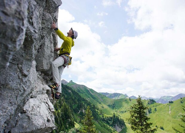 Da die Kletterrouten großteils erst in den letzten Jahren erschlossen wurden, ist die Absicherung unserer modernen Vollkaskomentalität entsprechend perfekt. Und der Wettersteinkalk war geologisch betrachtet sowieso immer schon perfekt. Die Tour „Boomerang“, welche die drei fitten Mädels heute an der Sonnenspitze auserkoren haben, bildet da keine Ausnahme. Boomerangförmig zieht sich die Kletteroute am Felswulst nach oben.
