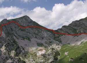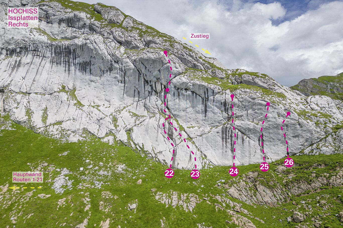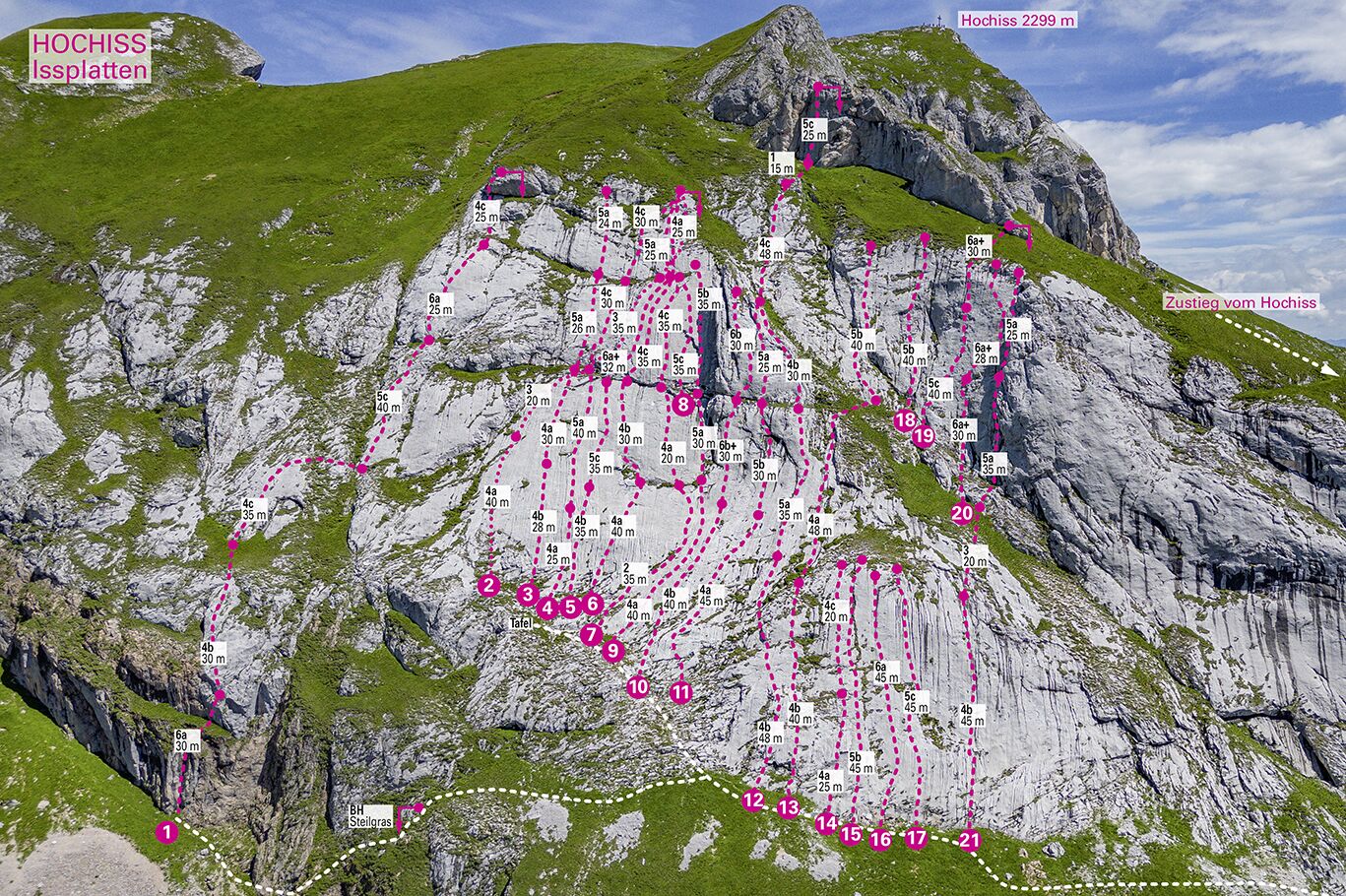 The Issplatten offer some of the best slab climbing around, with the slabs clearly visible from the Erfurter Hütte. Although the route is bolted, the climbing is still quite challenging and has a distinctly alpine character. Please note: The access route described in older guidebooks passes through a nature reserve. To help protect the area, we ask all climbers to follow the updated route to the Issplatten described below: Start by taking the normal route to the Hochiss via the Gamshals, stopping at a signpost just below the summit ridge. From here, head south-west and descend a few metres down a steep grassy slope to a wide grassy ridge. Follow the climbing tracks along this ridge, staying below the ridge tower, until you reach the Issplatten on your right.