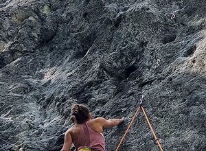 Ten vertical climbing routes with pockets and edges. Requires strength and endurance.