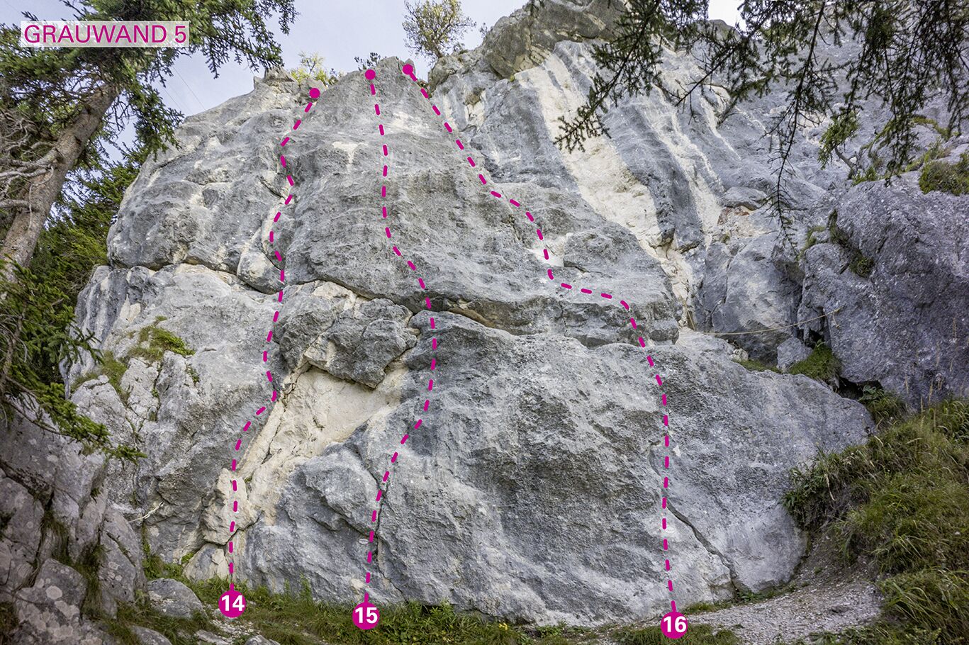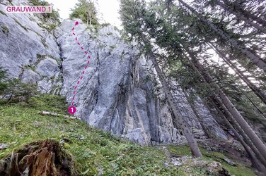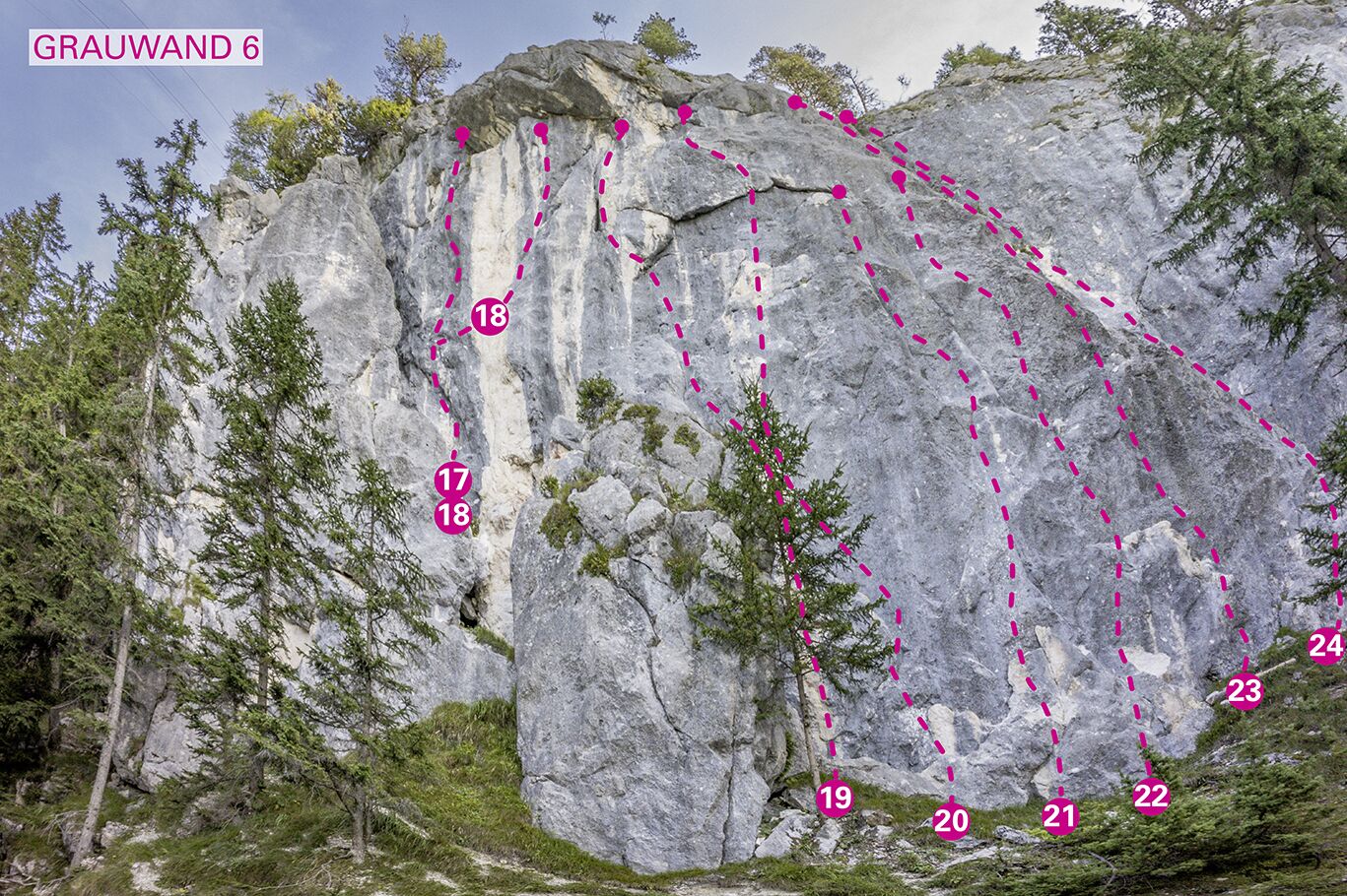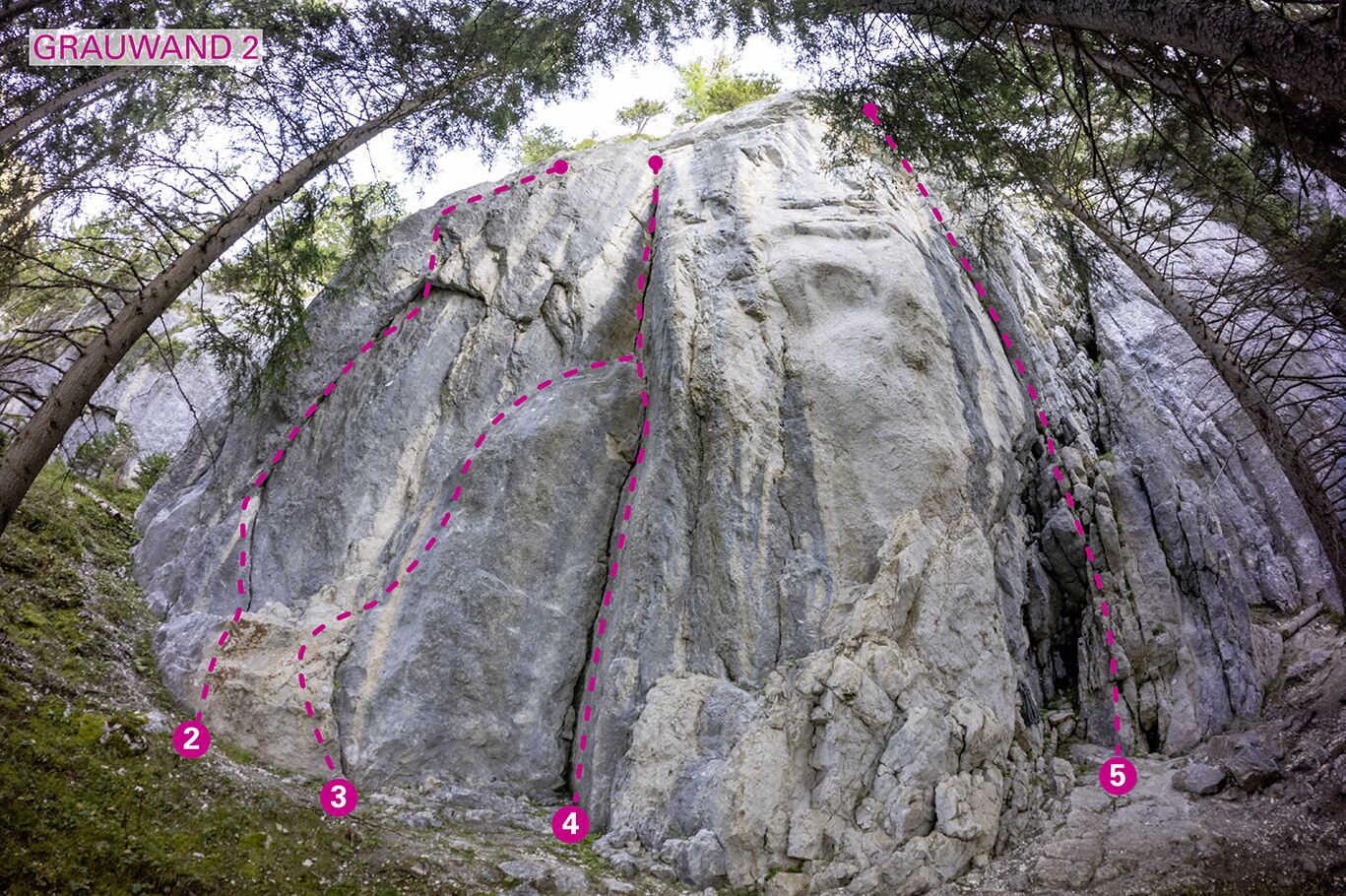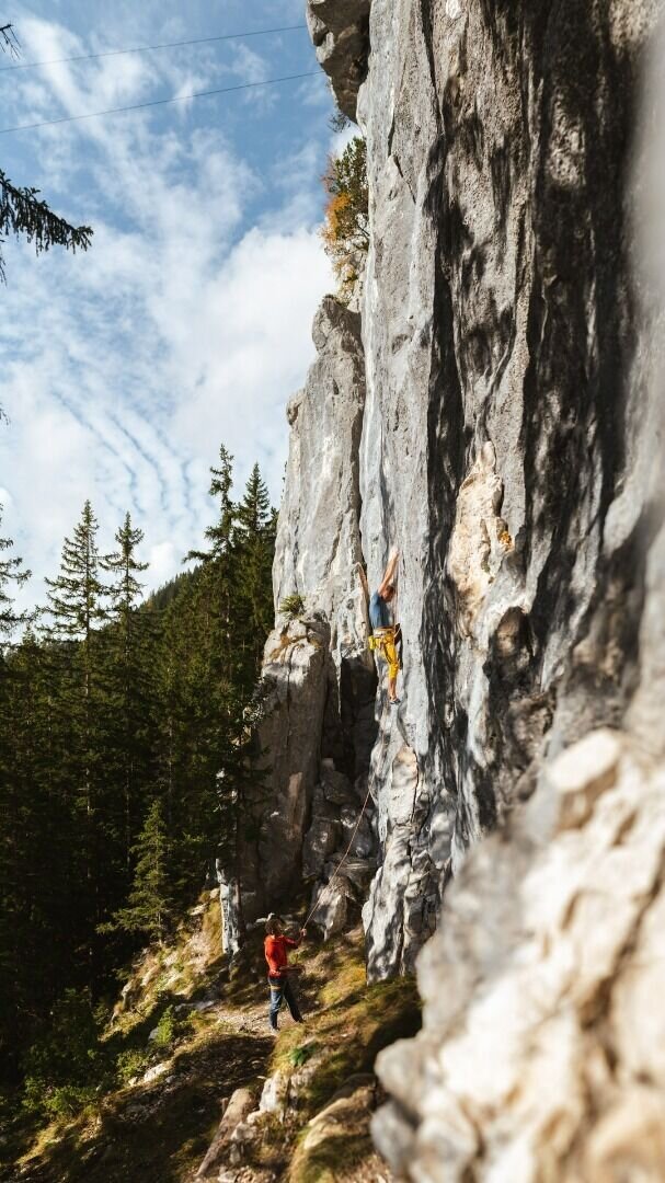 With 38 independent routes, the Grauwand climbing crag in the Rofan mountains offers some of the best limestone climbing. The routes are mostly vertical to slightly overhanging and required good climbing skills and technique. The south-facing climbing crag is up to 30 metres high and features routes graded 5c to 8a. The Grauwand was one of the first climbing crags in the Rofan. It was built by Hannes Salvenmoser and Otto Oelze in the summer of 1999. In the summer of 2021, all routes were renovated.
