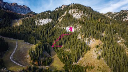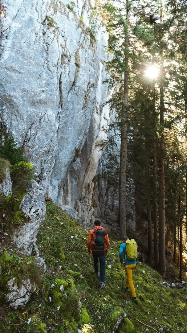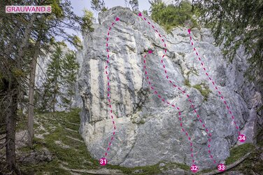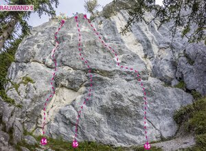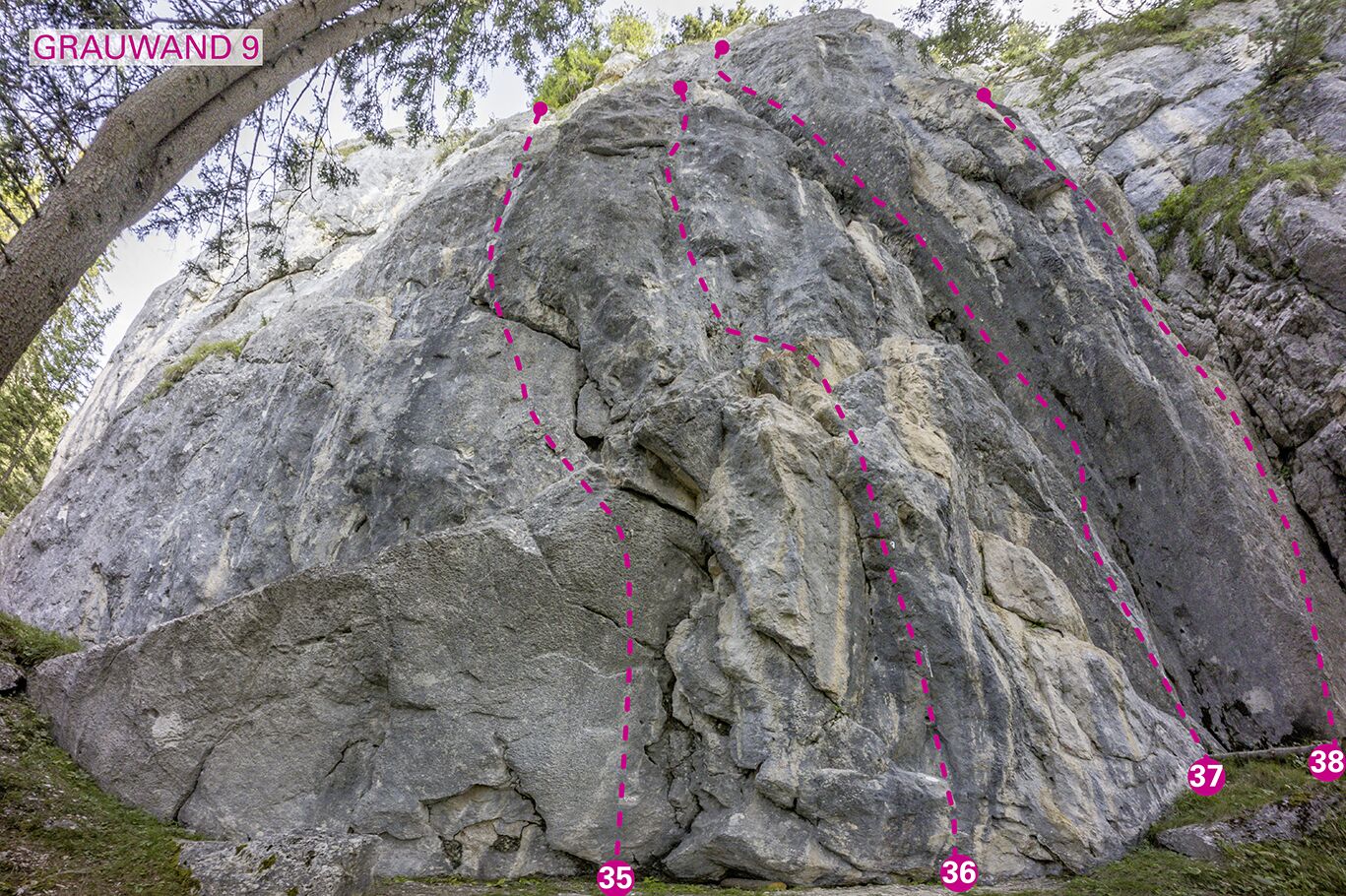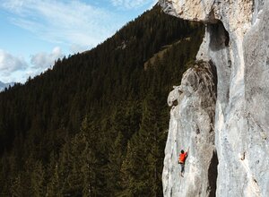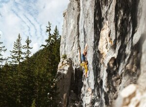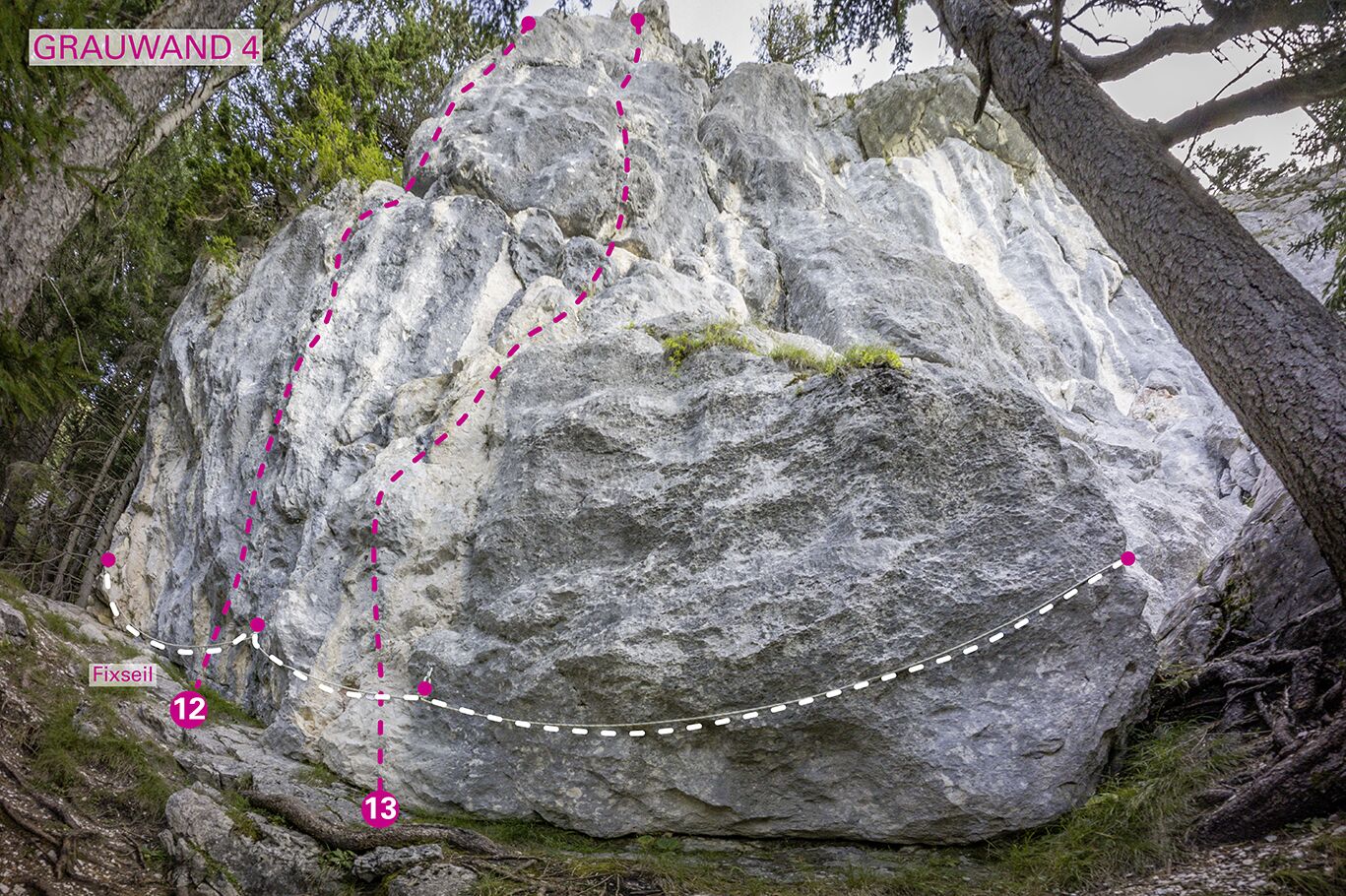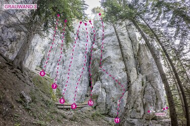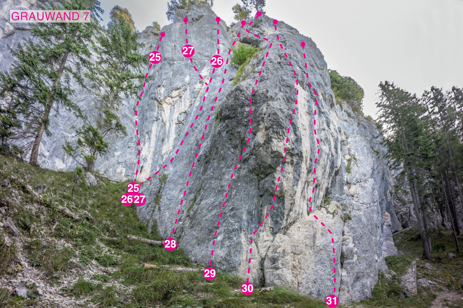 With 38 independent routes, the Grauwand climbing crag in the Rofan mountains offers some of the best limestone climbing. The routes are mostly vertical to slightly overhanging and required good climbing skills and technique. The south-facing climbing crag is up to 30 metres high and features routes graded 5c to 8a. The Grauwand was one of the first climbing crags in the Rofan. It was built by Hannes Salvenmoser and Otto Oelze in the summer of 1999. In the summer of 2021, all routes were renovated.