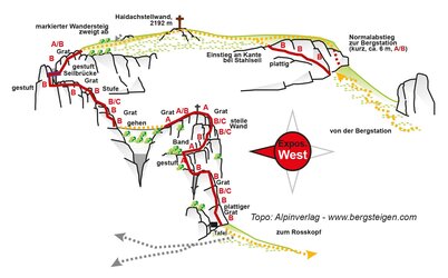From the top station of the Rofan cable car, follow the Grubersteig trail in the direction of the Rofanspitze. At the junction at an elevation of approx. 2,000 metres, follow the trail to the right in the direction of Haidachstellwand/Krahnsattel. At the next junction (at approx. 2,025 metres of elevation), turn right and follow the trail to the Haidachstellwand directly to the signposted starting point.