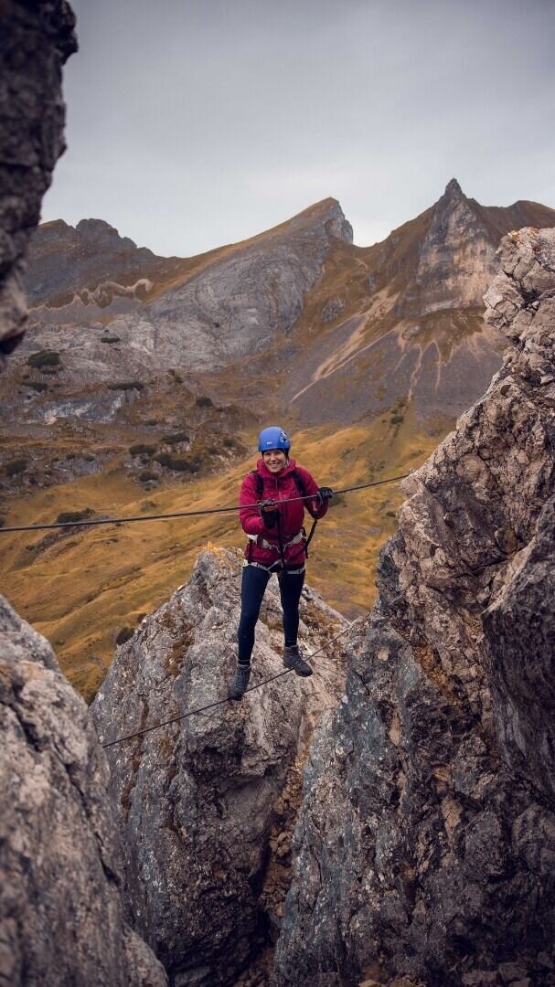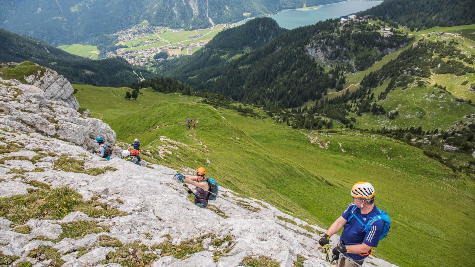 The Haidachstellwand via ferrata, formerly known as the Hans Obholzer memorial via ferrata, is now part of the Achensee 5-summit via ferrata. The approach is via the Grubersteig trail towards the Rofanspitze, and the route can be ideally combined with the Rosskopf via ferrata and the other climbs of the 5-summit via ferrata. Particularly impressive is the challenging, stepped rope bridge, which leads to a spectacular summit view from the Haidachstellwand (2,192 metres).