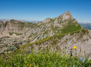 Descend on the grassy ridge of the Spieljoch and follow the yellow trail marking signs back to the top station of the Rofan cable car.