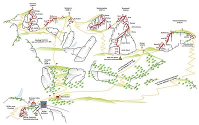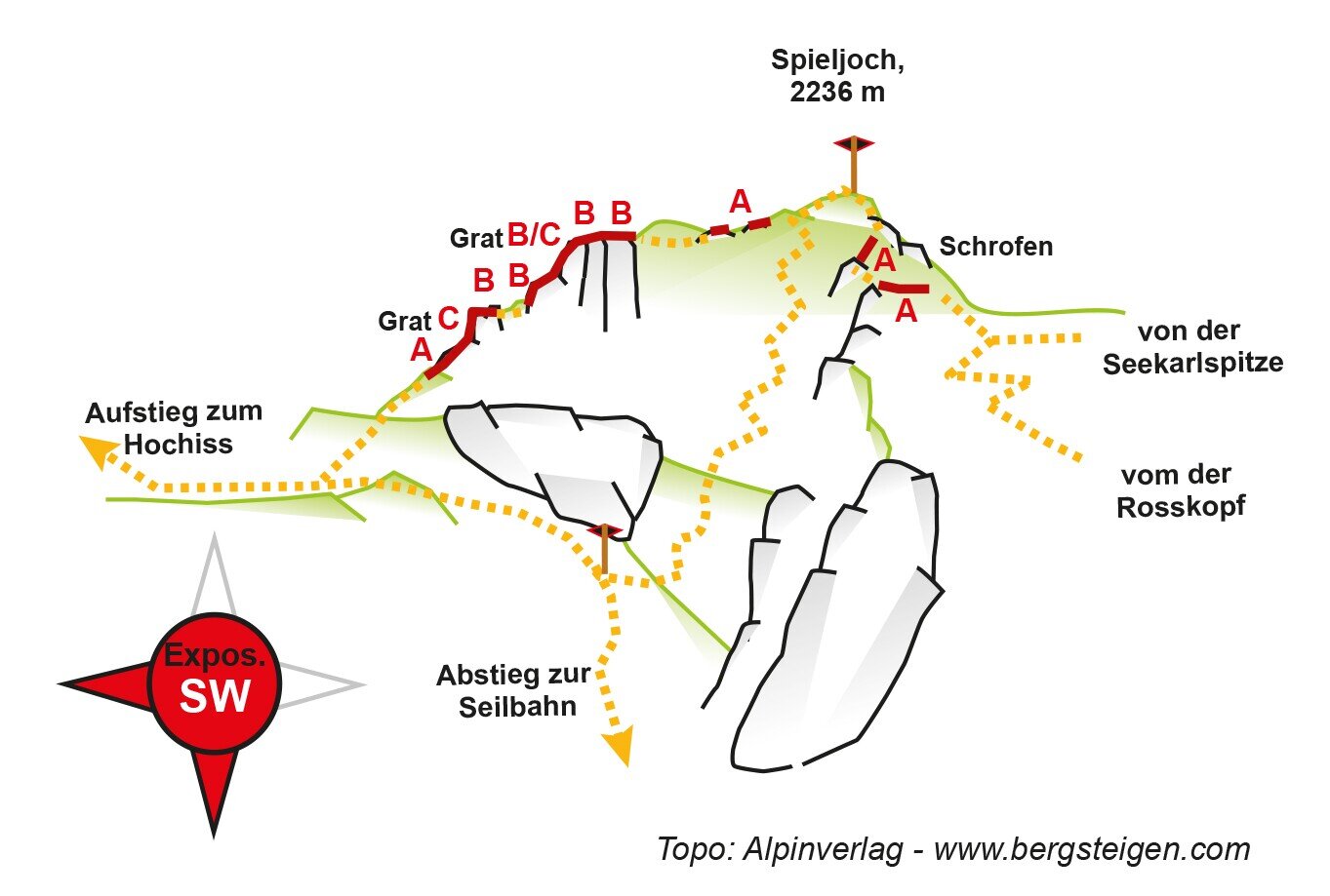 From the top station, follow the Grubersteig towards the Rofanspitze, at the Grubascharte turn left to the Spieljoch. Dangerous in wet conditions due to steep grassy sections!