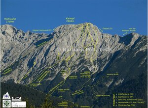 Ausgangspunkt für alle Südwandrouten am Karkopf ist Telfs dann Richtung Strassberg bis Parkplatz vor Schranken. AV-Karte "Wetterstein- und Mieminger Gebirge" Mitte 4/2