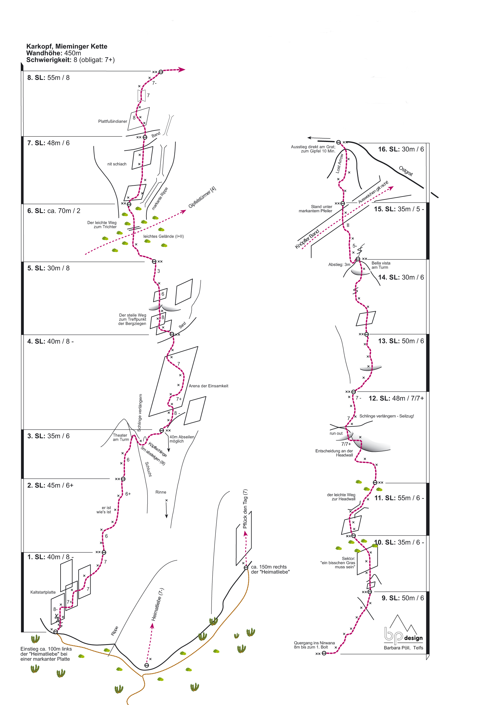 Es handelt sich um eine alpine Kletterroute. Alpine Erfahrung und etwas Gespür für die Routenfindung, sowie die Beherrschung des VII Schwierigkeitsgrades sind Kriterien für eine sichere Begehung. Die Route wurde von unten eingerichtet. Senkrechte Wandkletterei (Kalkgestein). Die Südwand des Karkopfes ist strukturiert, trotzdem ist die Felsbeschaffenheit als gut einzustufen. Besonders die schwereren Seillängen sind für die Mieminger Kette geradezu genial. Abstieg: Normalweg Karkopf (markierter Steig) zur Alplhütte, über Straßberghaus zurück zum Parkplatz (Gehzeit ca. 1h 45 Min.)