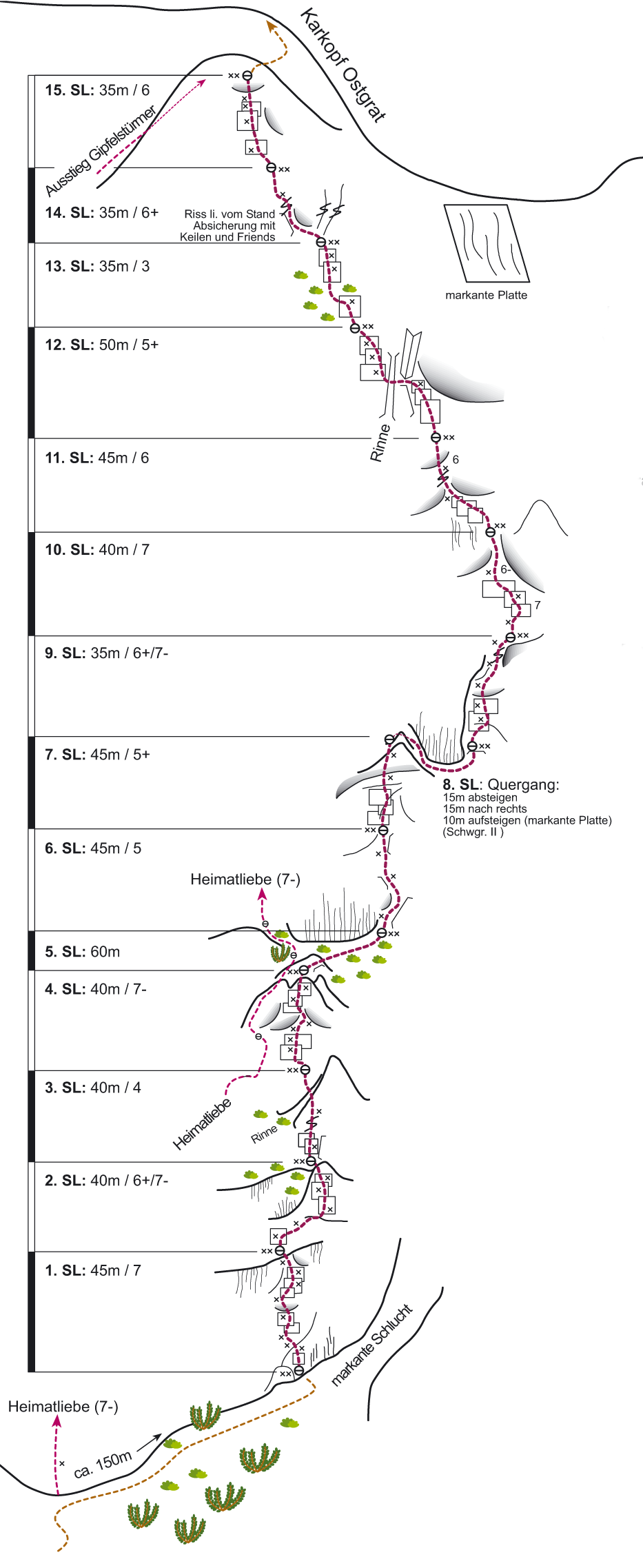 östlich zum Klettergarten queren. 20m unterhalb des