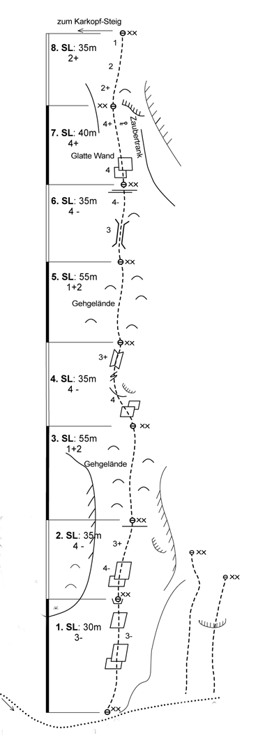Sehr gut abgesicherte Sportkletterroute für Kinder und Erwachsene. Abstieg: Vom letzten Standplatz 250m westlich leicht ansteigend bis zum Normalweg vom Karkopf (markierter Steig) Abstiegszeit: bis zur Alplhütte ca. 1h