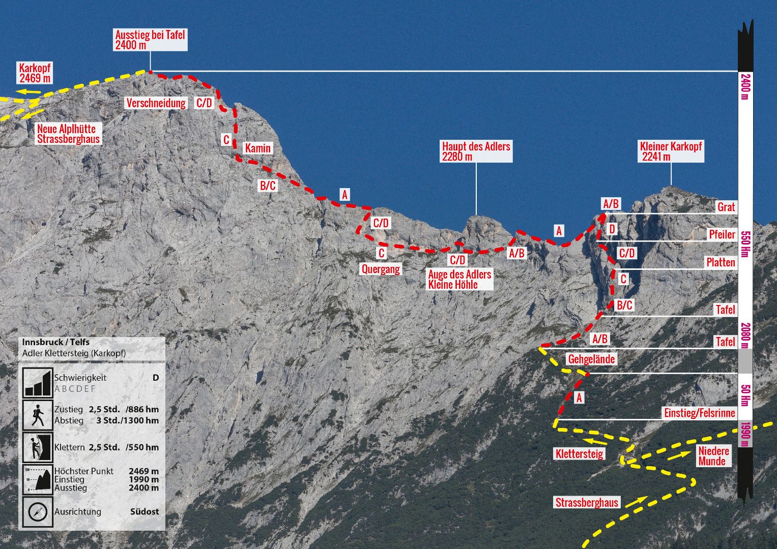 The Adlerklettersteig runs in the area of the Karkopf east ridge and partly in the south flank of the Karkopf and leads up to the summit plateau of Karkopf 2469 m. A beautiful, varied and long ascent, where difficult and airy climbing sections in best Wetterstein limestone alternate with easy ridge passages. In difficult places there are additional hooks to secure descendants with a rope. Refreshment and Overnight accommodation is available at the Neue Alplhütte, www.alplhuette.com.