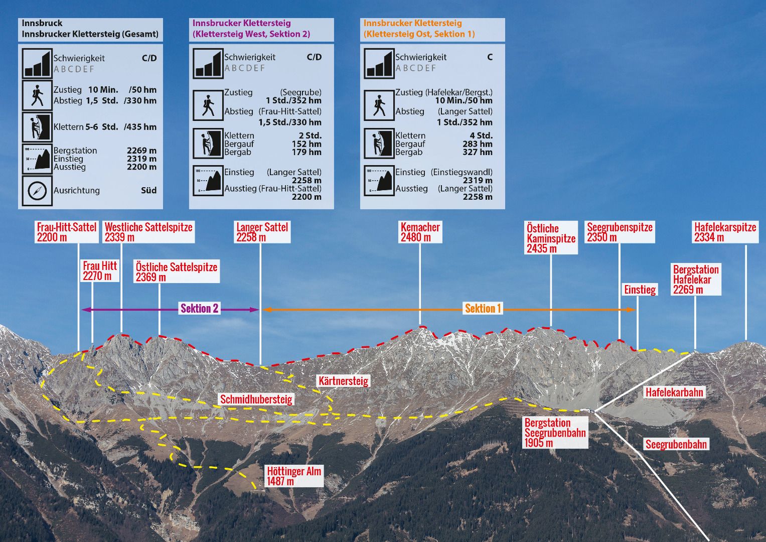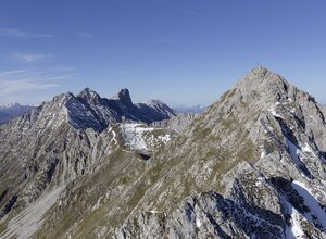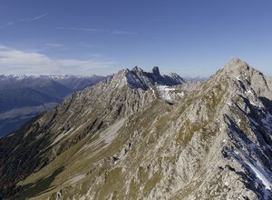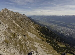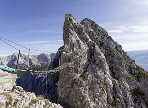 The Innsbruck fixed rope route leads over seven peaks of the Innsbruck Nordkette, accordingly the panoramic view is magnificent. The via ferrata consists of 2 sections. Section 1 leads from the top station Hafelekar 2269 m over the Seegrubenspitze 2350 m, the three chimney tops (eastern chimney top 2435 m, middle chimney top 2435 m, western chimney top 2445 m) and the Kemacher 2480 m to the Lange Sattel 2258 m. Section 2 runs from the Lange Sattel over the Western saddle top 2339 m to Frau Hitt or Frau Hitt saddle 2200 m. The first part with of an original suspension bridge runs mainly on the ridge, the second part is somewhat more demanding and leads over many rock towers, embrasures and steep wall passages. The entire via ferrata has a length of about 3.5 km and offers an incredible view of the glaciated mountains of the main Alpine ridge and the Inn valley.