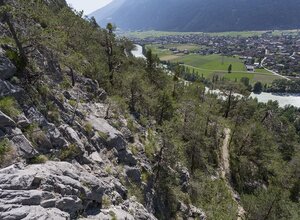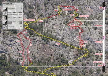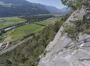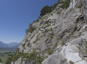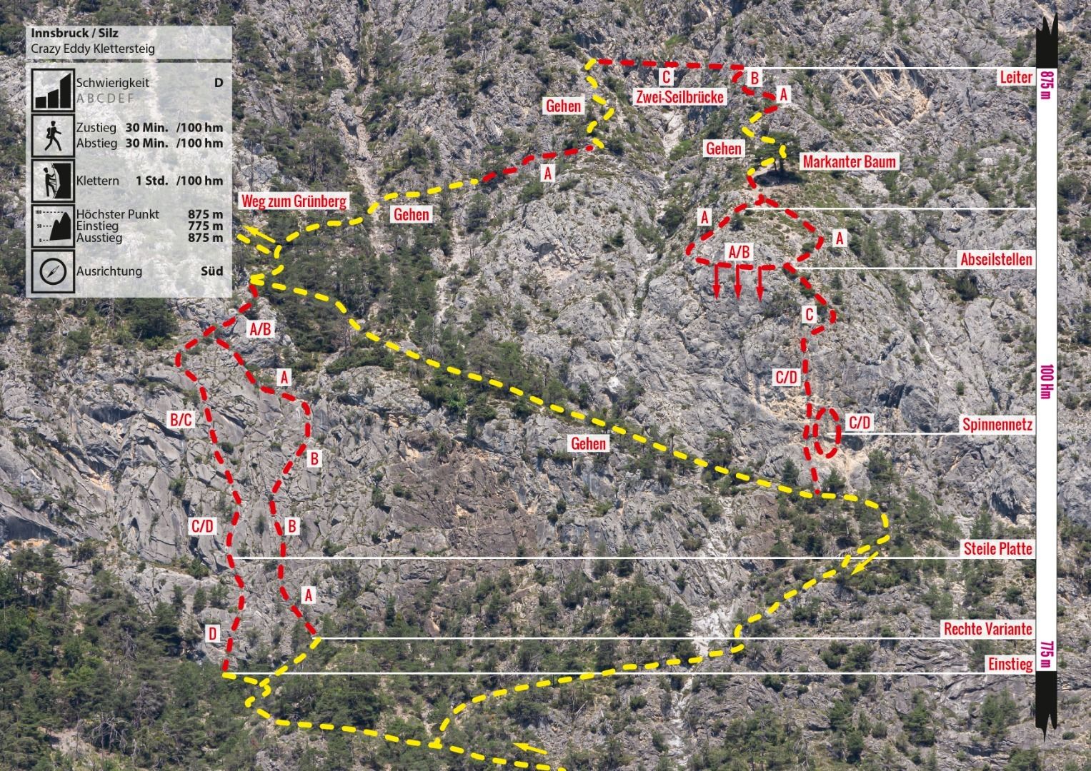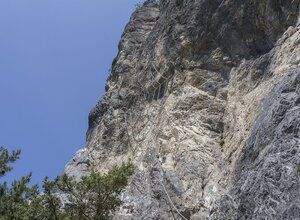 A sport and fun climbing route with rope bridge, abseiling point and a spider web. The Silzer via ferrata is more a climbing fun park than a classic via ferrata. Attention, the rope bridge is not suitable for smaller people, because the upper rope is not accessible for them. All passages can be bypassed or can be reached via alternative routes. The "stations" can also be walked in any order and direction. The access to the via ferrata with the two variants is very short and easy. The left via ferrata is (C/D) leads to the rope bridge (blue marking). After the rope bridge (B/C) you can abseil down to the spider (own double rope 50 m, abseiling device etc. required). Or after the rope bridge you can descend to the spider on the same way back. When walking on the spider's web or the ladder, a second person can secure you from above with an additional rope. The stands for this are available.