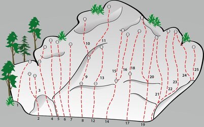 An old quarry that was renovated for climbing. Suitable for beginners and families and very short access. A climbing helmet is highly recommended. Parking in the surroundings of the former Sebi Inn. Because of the many horizontal ribbons and heels in the upper part of the climbing garden, falling is not harmless despite the good protection. An extremely concentrated safety work is still absolutely necessary also in the upper area. The street noise reduces the climbing experience somewhat.