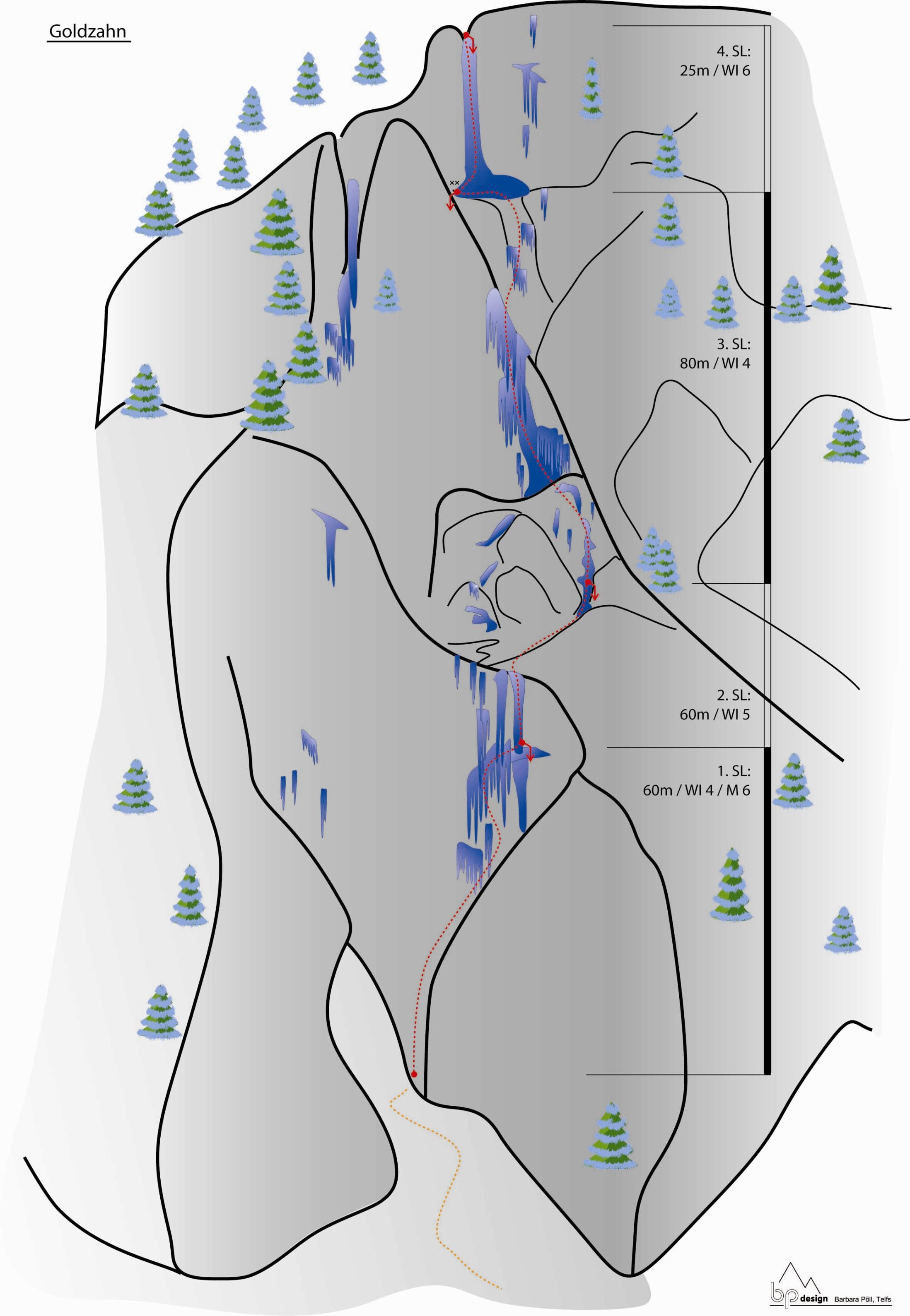 Zustieg: über kurzen Stichweg ca. 50 m auf ein offenes Feld und weiter über einen steilen Hang, der in eine Rinne mündet in ca 30 Minuten zum Einstieg.