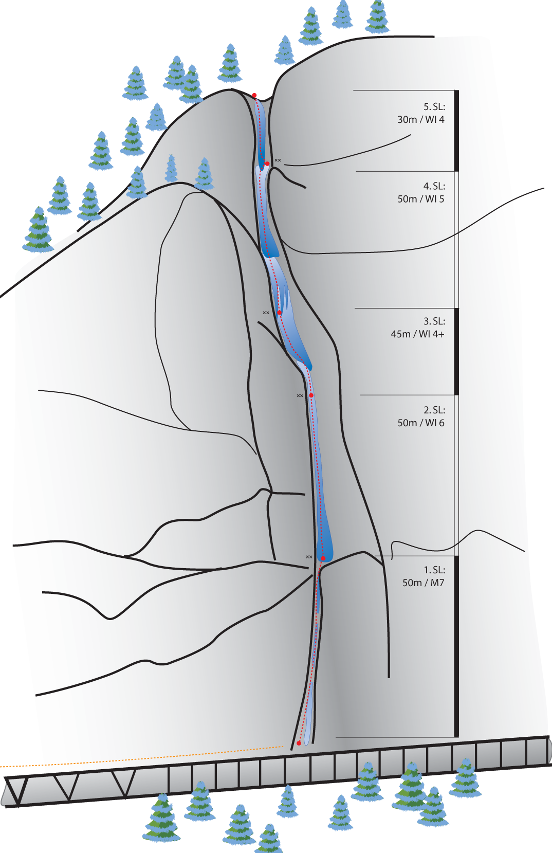 Leider hat dieser versteckte Kamingully nur sehr selten genügend Eis, und leider auch dementsprechend wenig Begehungen. Vom Gesamtanspruch wahrscheinlich einer der schwierigsten Wasserfälle im Tiroler Oberland.