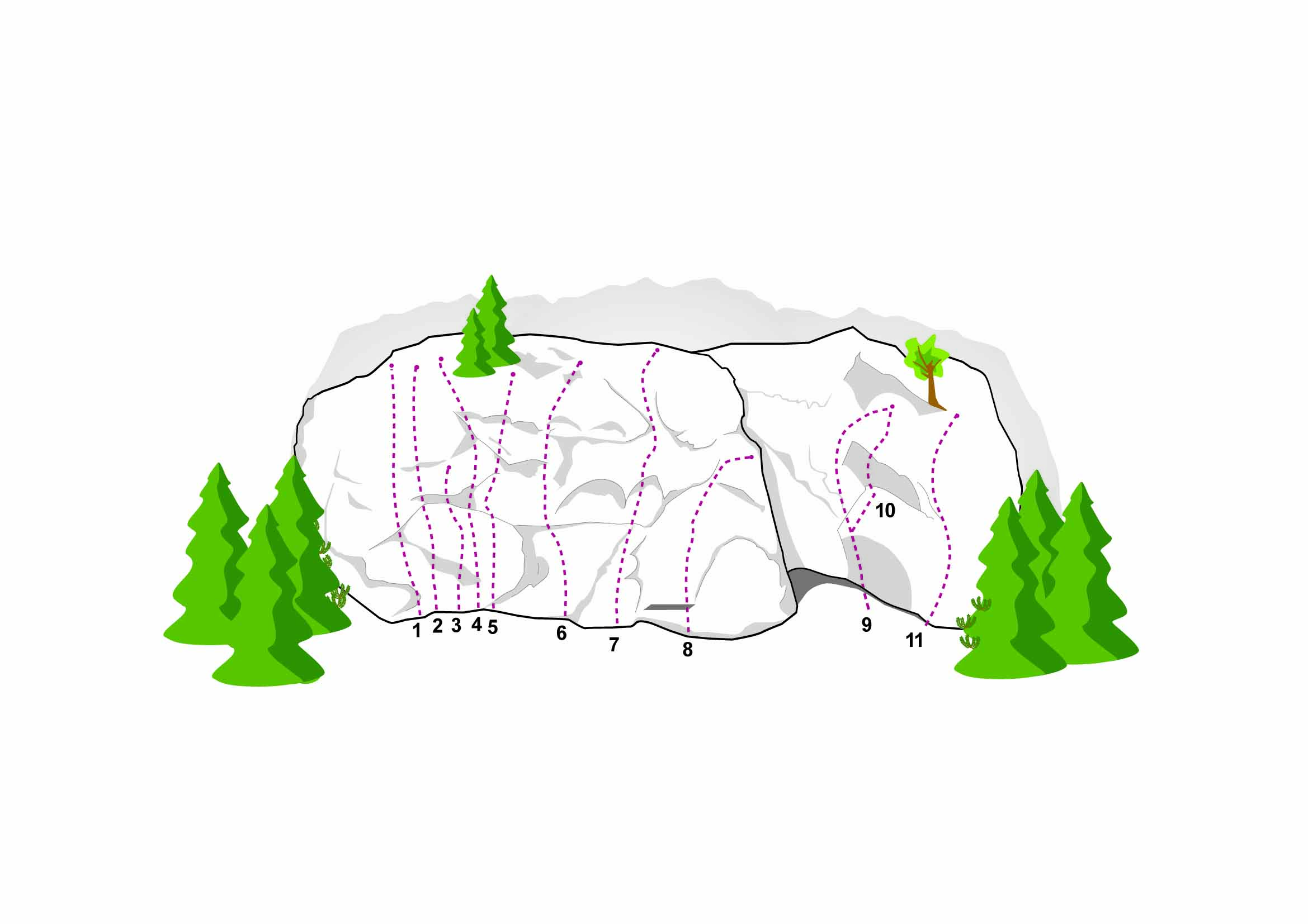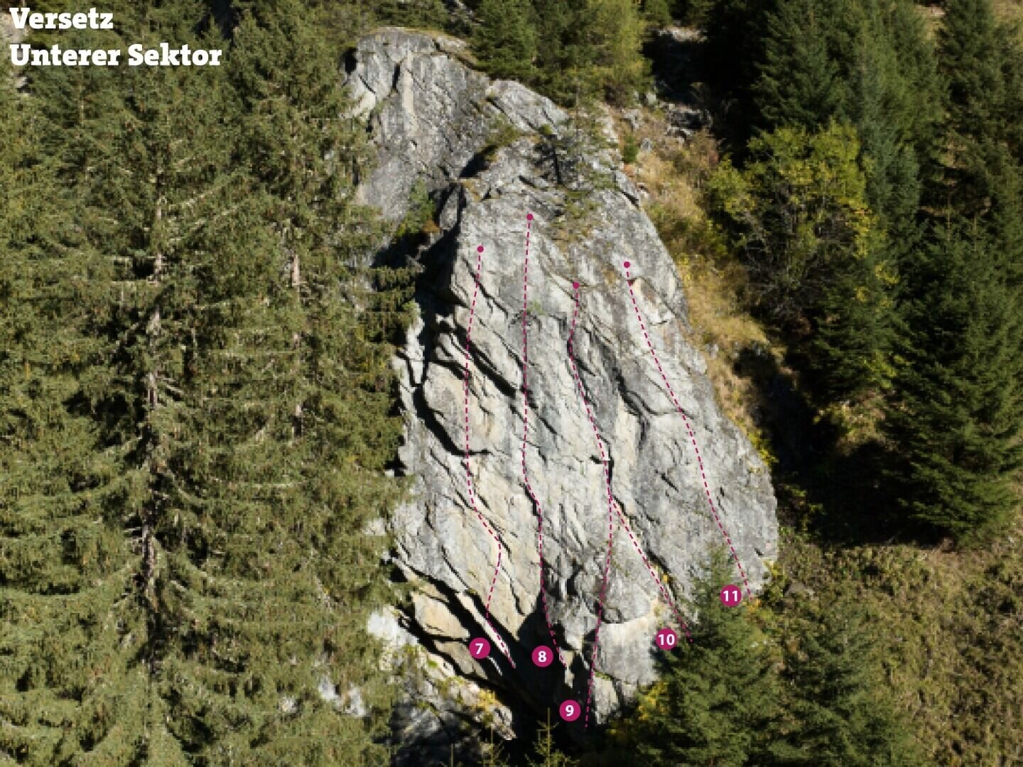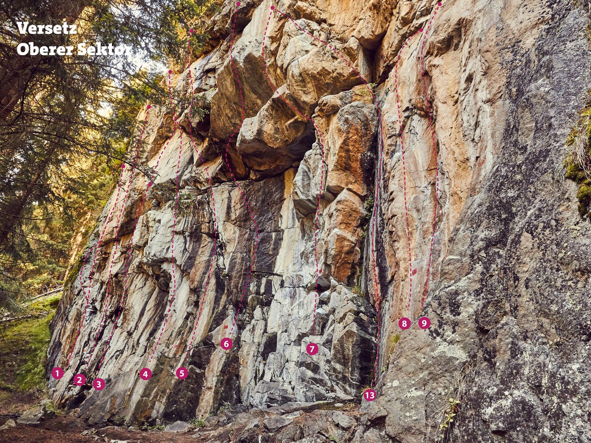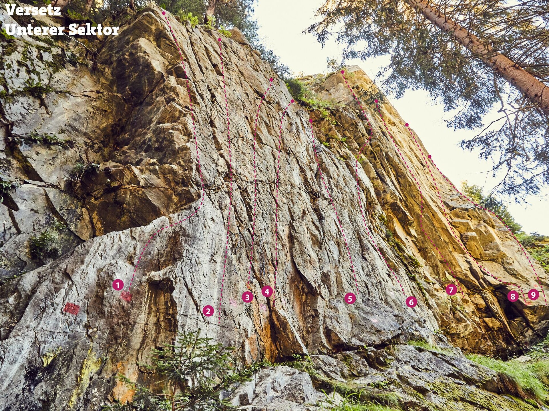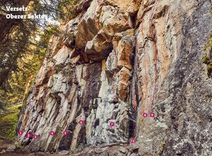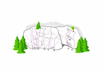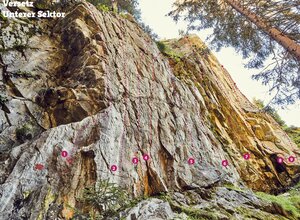This area consists of two sectors. There are 22 routes of medium difficulty (5c to 7b). in best rock quality. After heavy rainfalls the wall stays wet longer. Don't forget the mosquito spray.