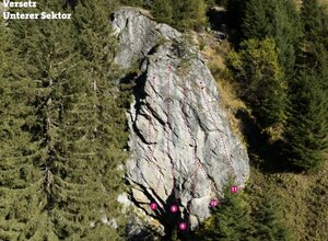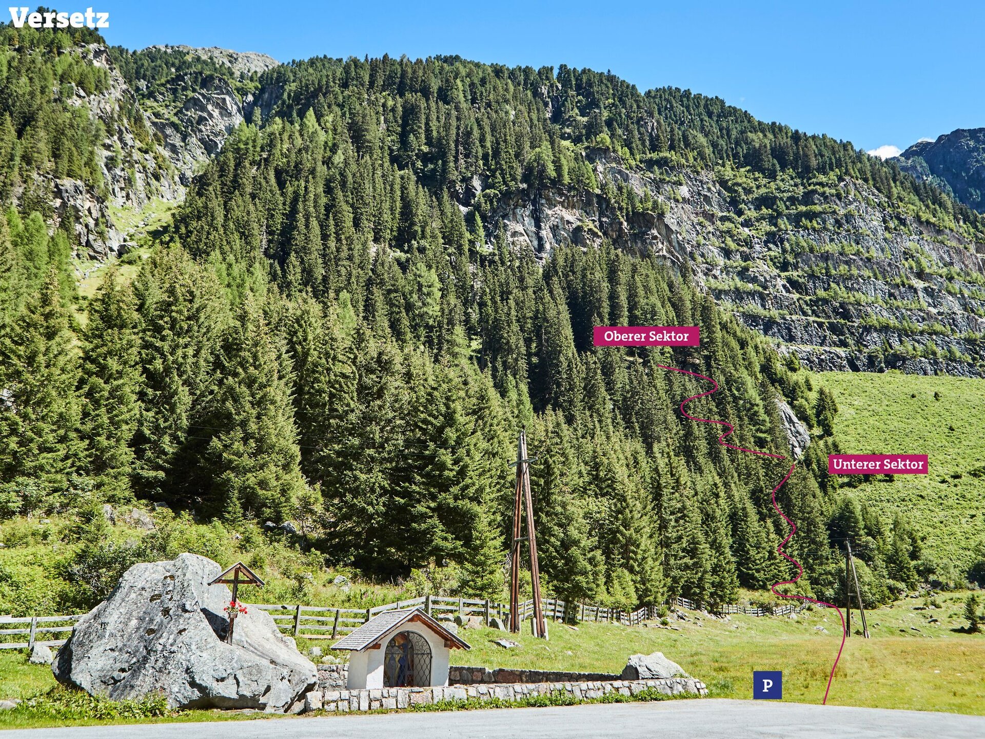 Kaunertal, park about 5 km after the toll station at the Steinbockstein on the left side of the chapel. From here you can already see the first sector and follow the markings (fence) across the meadow past the electricity pylon. The second sector is on the left above in the forest.