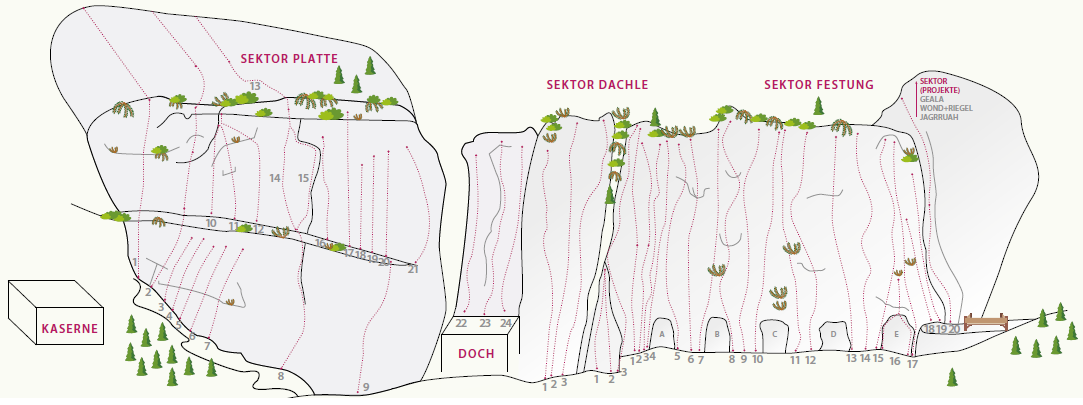 Der Klettergarten liegt direkt an der alten Römerstraße Via Claudia und auf dem Gelände vom Museumsverein wo man ua. auch verschiedene Exemplare von Panzern vorfindet. Mehr hierzu unter: http://www.museumsverein-nauders.com/geschichte.html Vorsicht: Wie bei allen Klettergärten mit großem Einzugsgebiet über der Wand kann Steinschlag nie ausgeschlossen werden. Entsprechendes Verhalten und das Tragen eines Helmes ist daher dringend zu empfehlen.