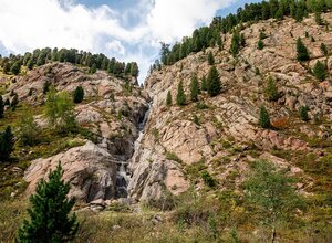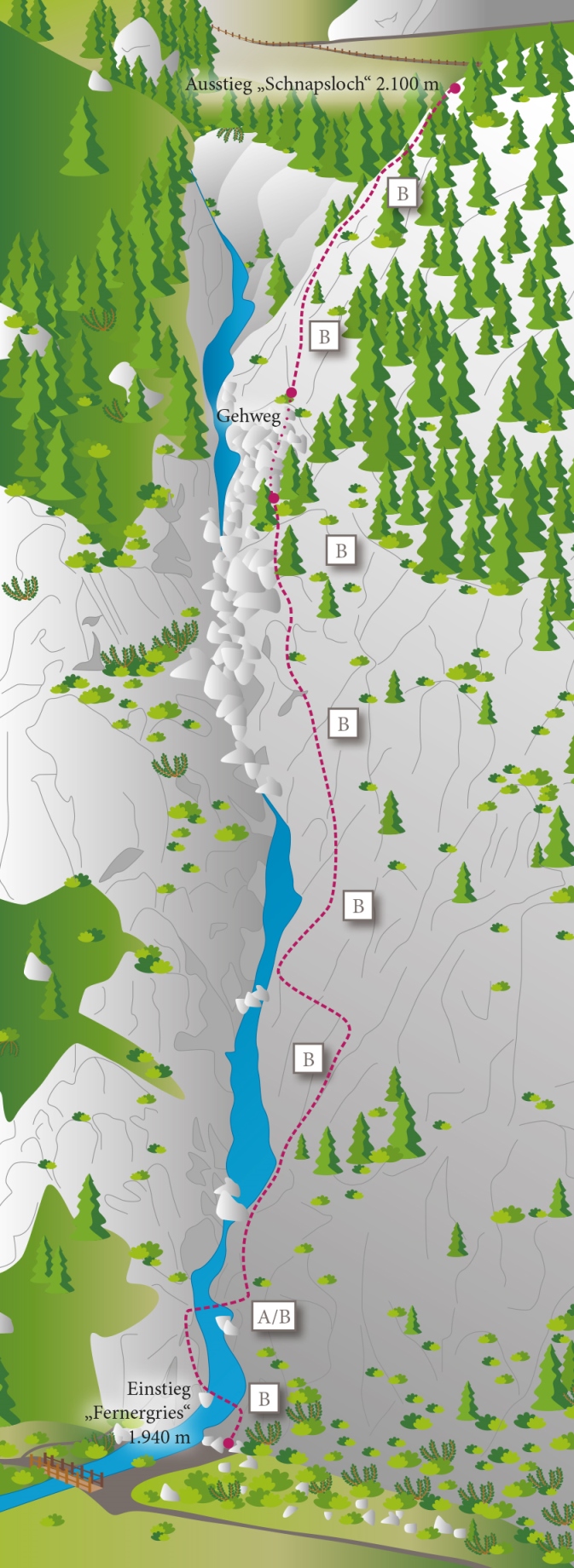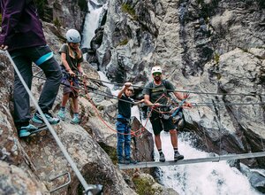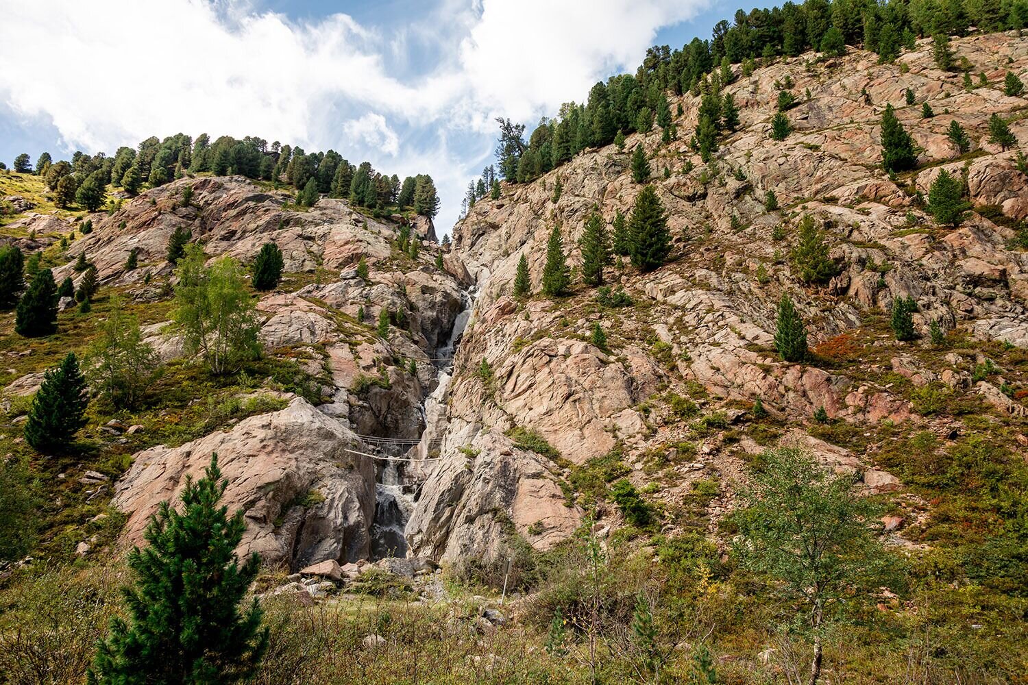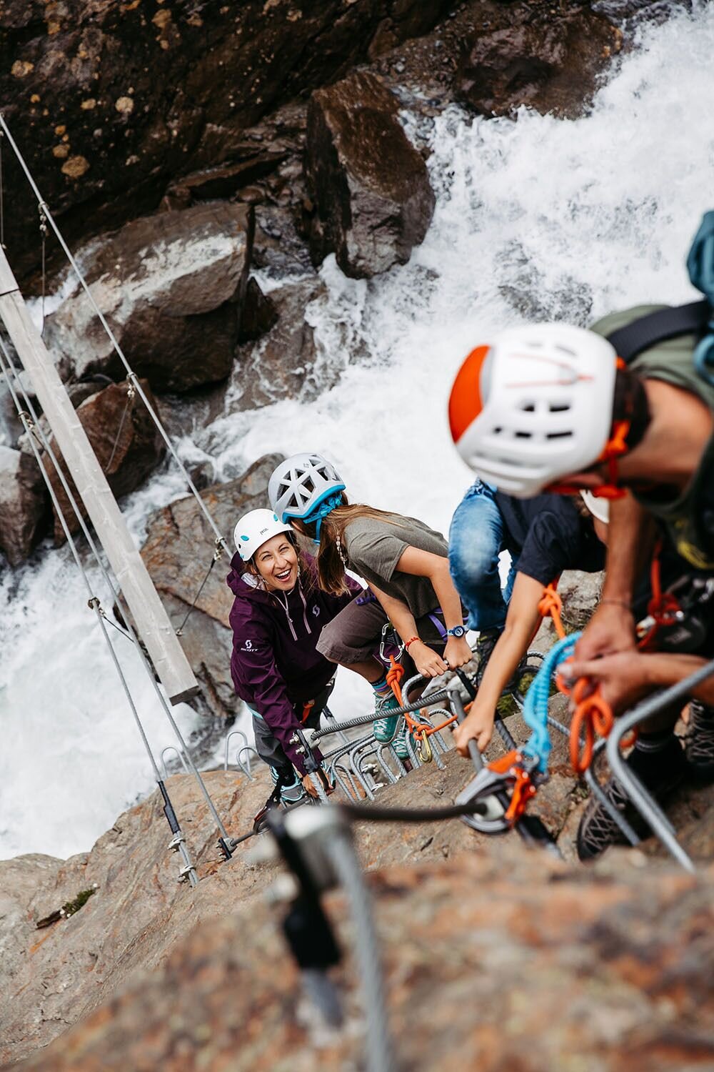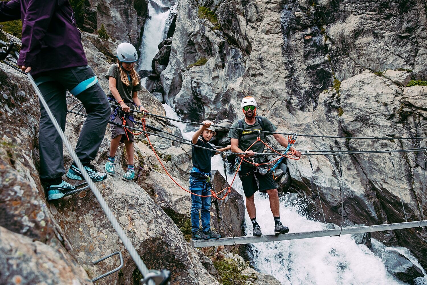 The via ferrata Fernergries - in the rear Kaunertal valley impresses with its impressive scenery. Over polished glacier mica gneiss, the start of the route is at the impressive Rifflbach waterfall - in Fernergries. Starting to the left of the waterfall you cross the thundering brook over a bridge and then climb along the watercourse over slabs to a small "floor" where you can have a short rest. The 2nd part is a steep section that climbs up at a rapid pace until you reach the end of the via ferrata at the so-called "Schnapsloch".