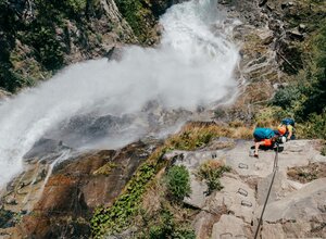 After another traverse, the entire Stuibenfall waterfall reveals itself, leaving climbers in awe of the sheer force of the thundering water masses. The upper rope bridge challenges experts to dance across this untamed waterfall. To the right of the waterfall, the final meters to the exit at the suspension bridge are quickly overcome. For a more relaxed finish, an easier variant remains on the left side of the water, leading comfortably to the exit right by the suspension bridge.