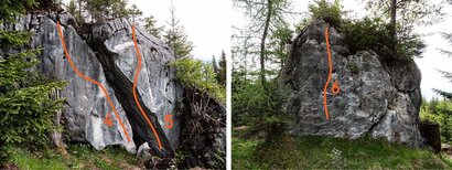 Take the Imst Mountain Lifts up to the Untermarkter Alm hut. Follow the forest road downward for 10 minutes to reach the bouldering rocks with routes 1 - 15.
