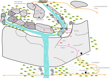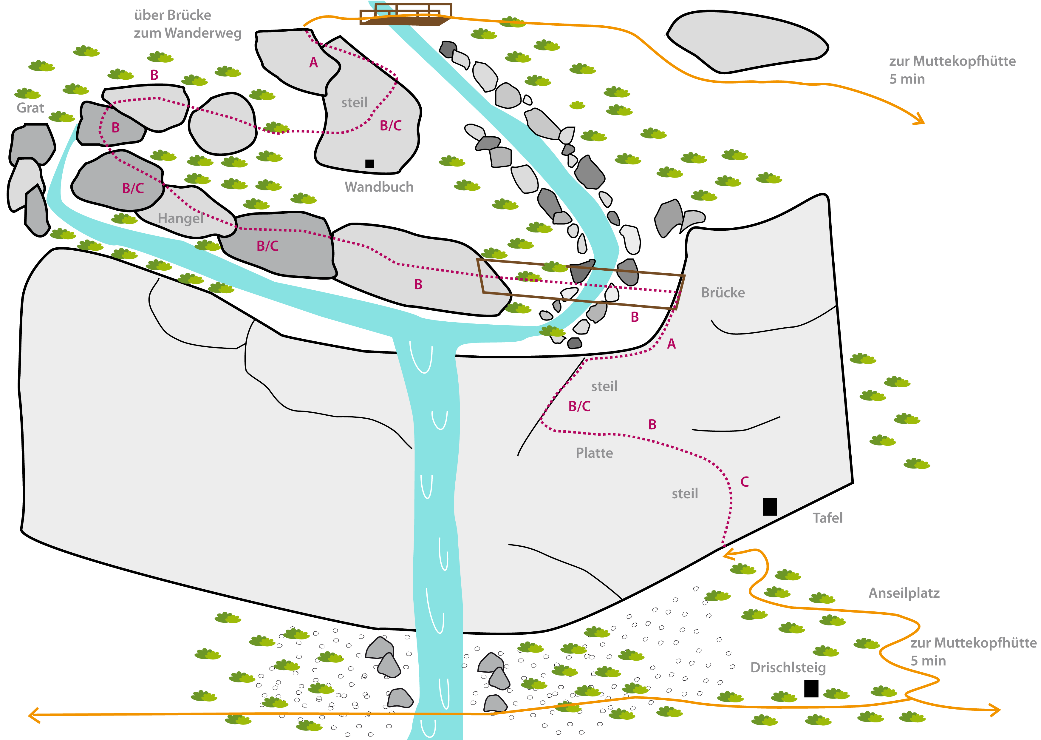 Exit the motorway A12 at Imst and take the entry/driveway 4 (look at the map) up to Hoch-Imst. With the lift up to the summit station of the Alpjoch and via the Drischlsteig (exposed - Caution with children) in 30 minutes to the Muttekopf Hut. You can also reach the hut by foot in ca. 2,5 hours from Hoch-Imst. From the hut within 15-30 minutes to the individual sectors.