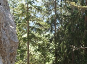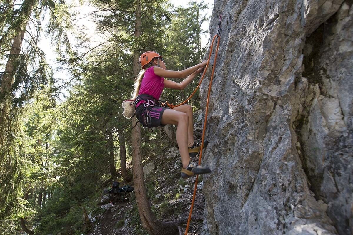 The approach follows a well-marked path (orange sign "Klettergarten Mauerbogen"). It takes 15 to 20 minutes uphill, but the hike is not difficult. If you're not in a hurry, you can take your time, take pictures of flowers, enjoy the view, and explore the "fern forest." The area is suitable for children, but because of the climbing style (very compact rock), it may not be the best choice for young beginners.