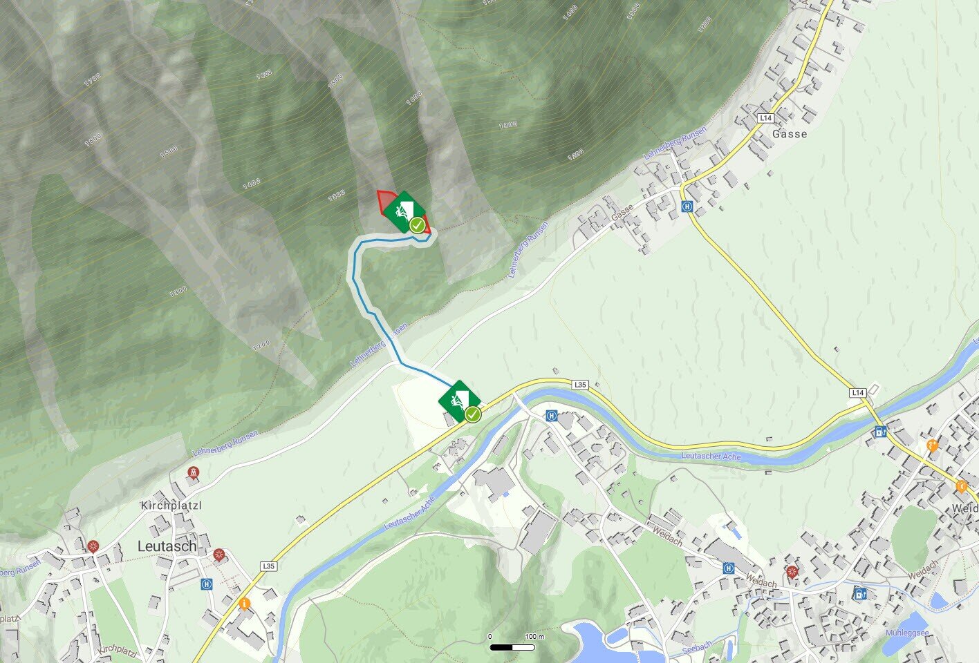 Drive in Leutasch along the main road towards Kirchplatzl and turn at the intersection for the soccer field. The "Parkplatz Fußballplatz" P21 is located on the left side.