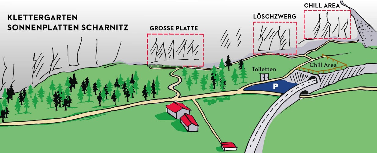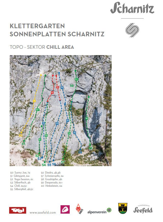 A chill-out area with tables, benches, slacklines, and a fountain for refreshing and relaxing has also been created. A high-quality toilet facility and numerous parking spaces nearby complete the “Sonnenplatten Scharnitz” climbing area. Climbing shoes on, harness fastened, chalk ready – and off you go! Find your favorite route in the 3 to 7 difficulty range.