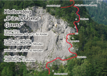 Short, rewarding beginner via ferrata directly in the village of Weißbach. The via ferrata runs on the right-hand side of the AV climbing garden and is very well secured with stirrups and steel rope. Suitable for children! Ideal to combine with the romantic Seisenbergklamm gorge.