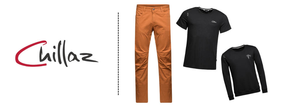 Die Tiroler Klettermarke Chillaz sponsort ein Set aus Kletterhose (Squamish, Gr. M), Longsleeve (Hokkaido Rope Sweater, Gr. M) & T-Shirt (Chillaz Mountain Logo, Gr. M)!