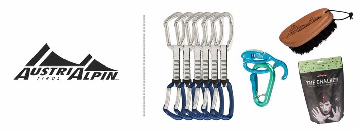 Austrialpin verlost ein Set der neuen, ressourchenschonenden ELEVEN RAW Expressschlingen (6x), Sicherungsgerät Fish, die Griffbürste Mount Brushmore und ein Chalksackerl.