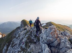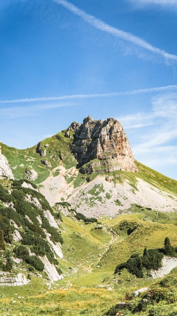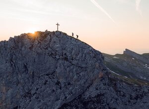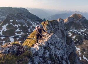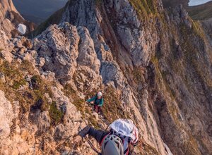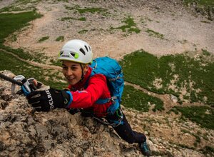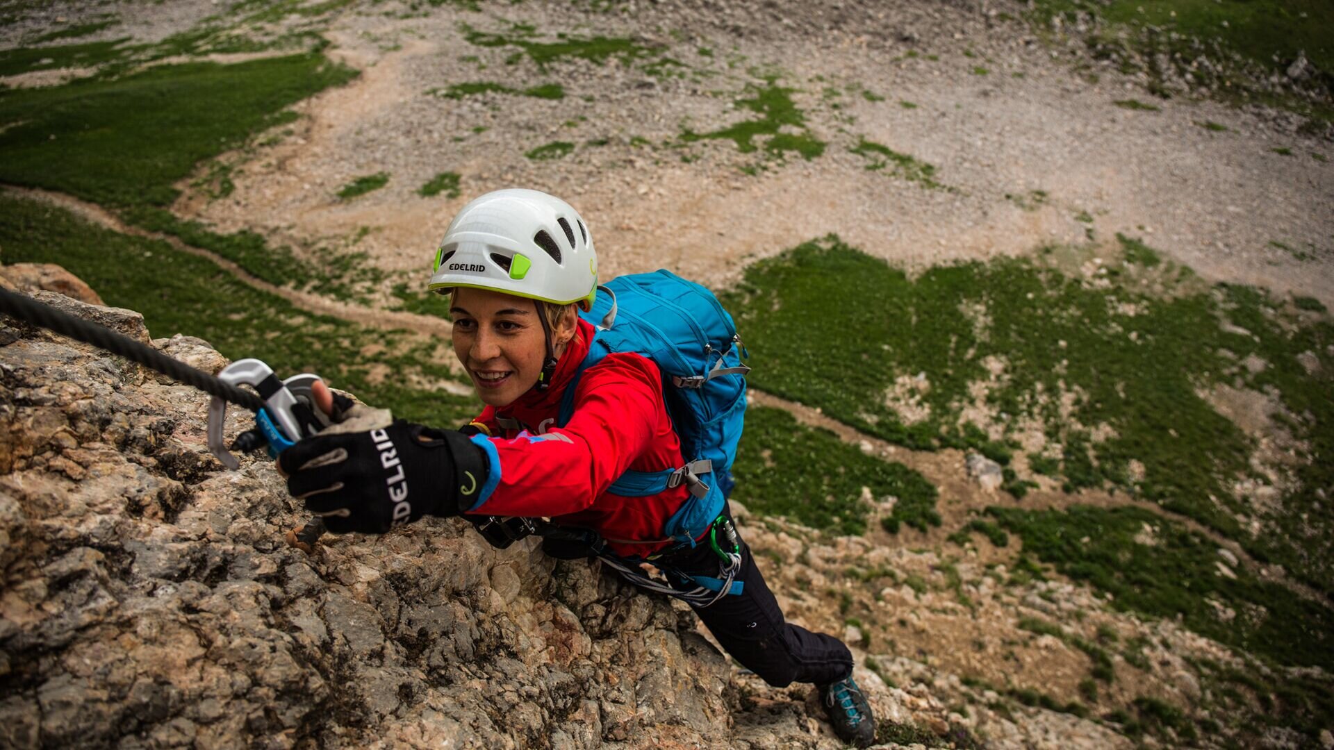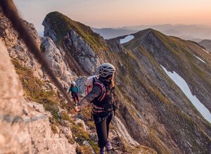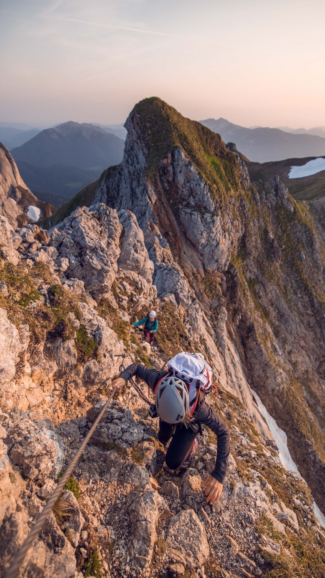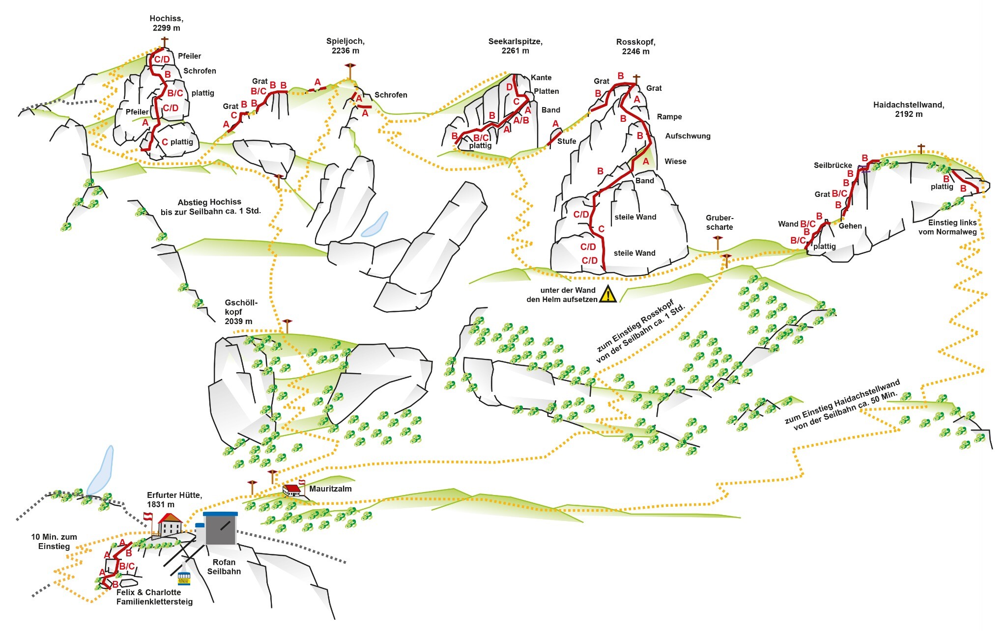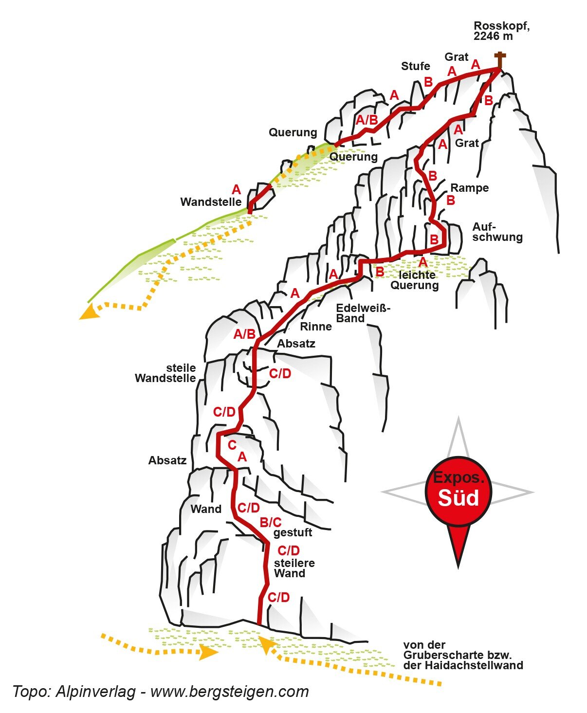 Steiler, dolomitenähnlicher Steig im Rofangebirge mit vielen Edelweißnestern. Die eindrucksvollste Passage am Rosskopf Klettersteig ist die Einstiegswand und der darüber liegende gelbe Aufschwung.