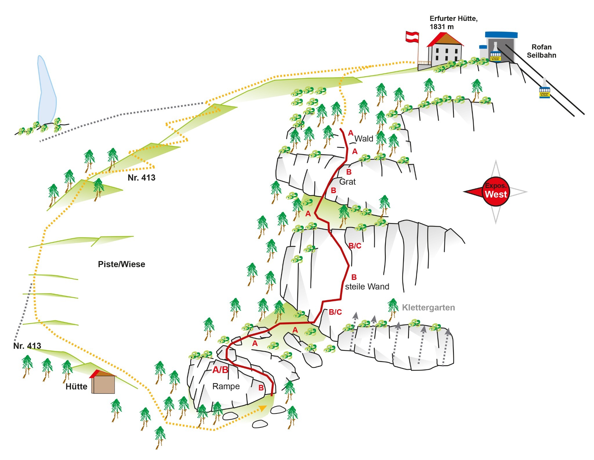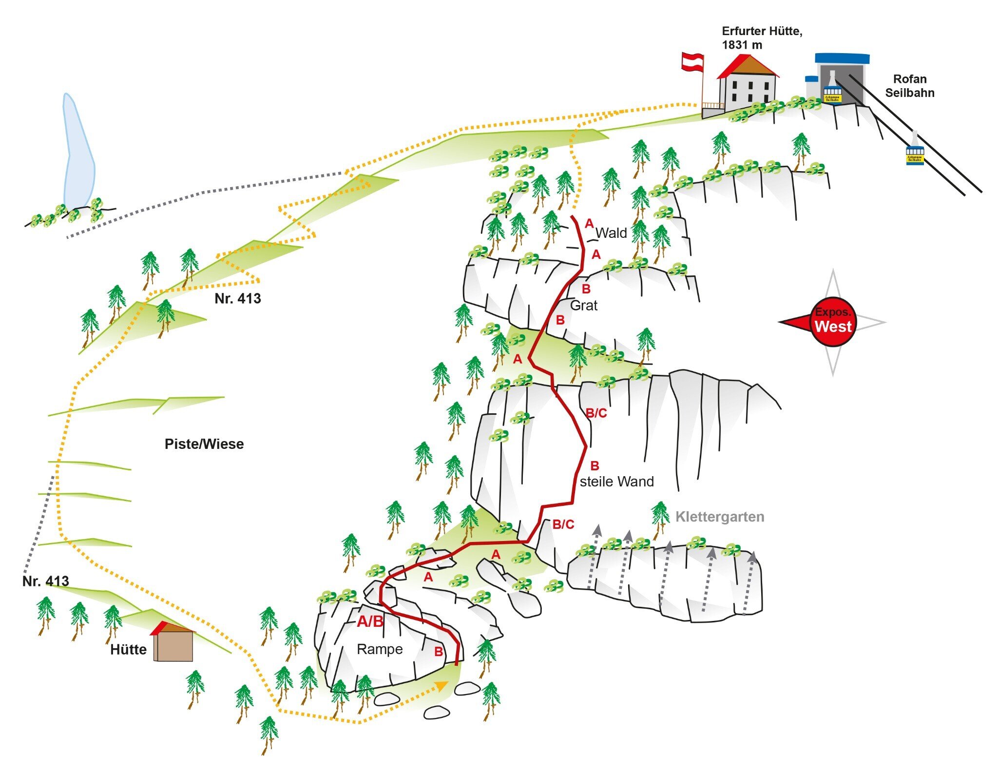 Von der Bergstation links auf Weg Nr. 413 (Enzianweg) in Richtung Durrakreuz bzw. Dalfaz Alm. Nach wenigen Minuten erfolgt ein steiler Abstieg in Zickzacklinien am Rand der Skipiste über Weidegelände. Wo das Gelände flacher wird, nach links über die Wiese (kleine Hütte) zum Waldrand queren. Dort kurzer Anstieg zur Einstiegsstelle an einer kleinen Felswand.