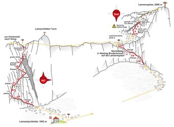 Vom Ausstieg dem Weg westwärts zur Lamsenscharte (2.279 Meter) folgen. Von dort entweder weiter zum Gipfel der Lamsenspitze oder auf dem versicherten Normalweg hinab, unterhalb der Ostwand ins Lamsenkar und zurück zur Hütte (ca. 1 Stunde)