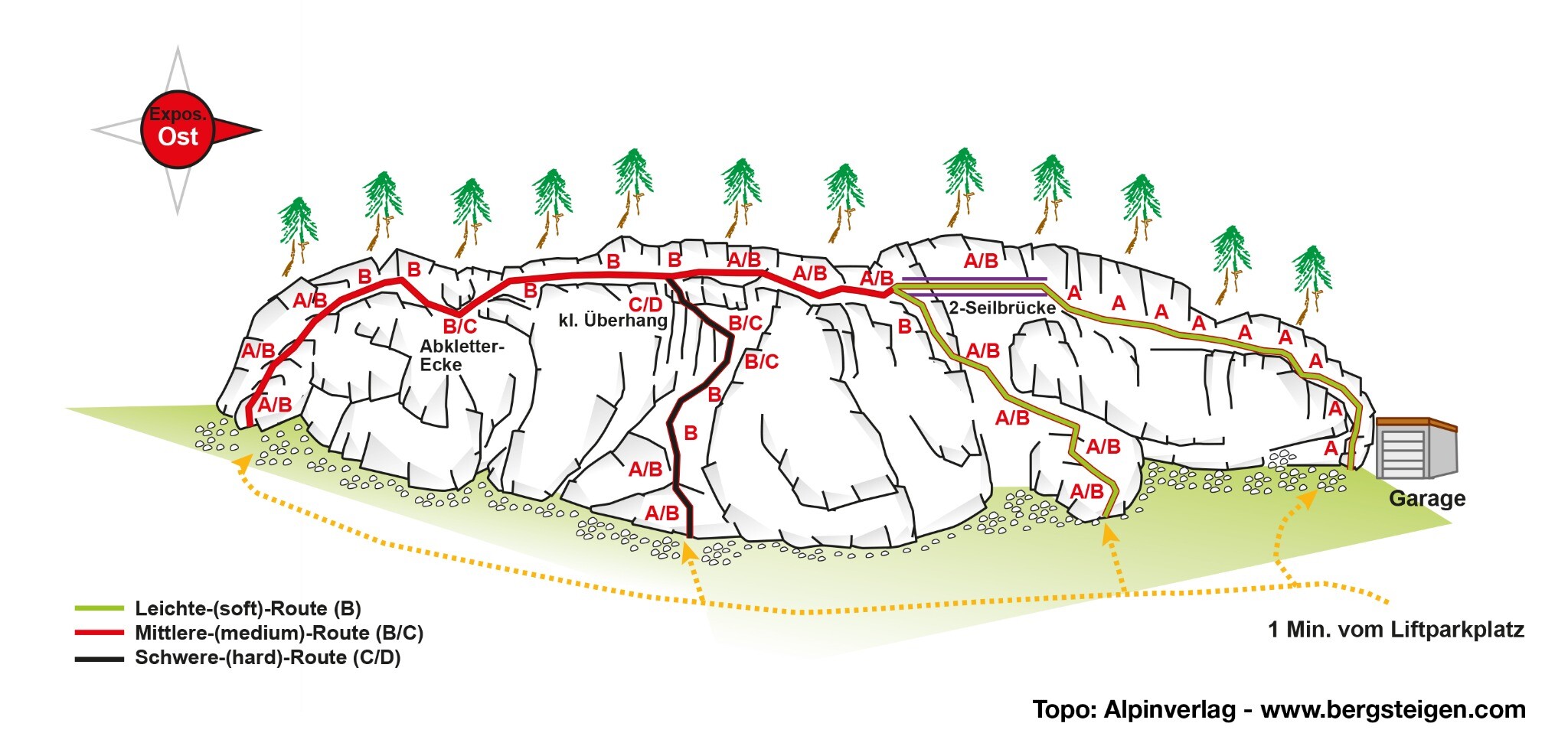 Ob für den Einstieg, zum Üben oder zum Verfeinern der Technik – mit verschiedenen Schwierigkeitsgraden (A/B, B/C, C/D) und nur wenigen Metern Zustieg bietet dieser Klettersteig optimale Bedingungen für jede Altersklasse (für Kinder ab 5 Jahren geeignet).