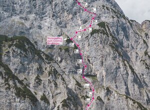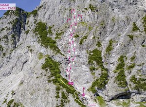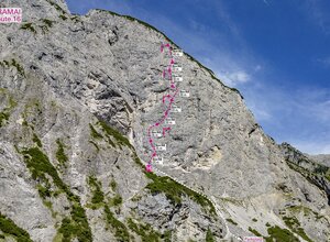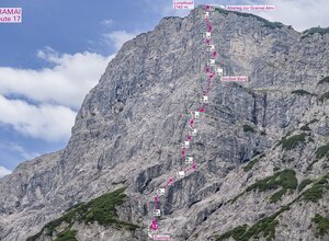 Von der Gramai Alm die markante Schlucht hinauf (3. Grad - keine Sicherungen) bis Markierungen zum Einstieg leiten.
