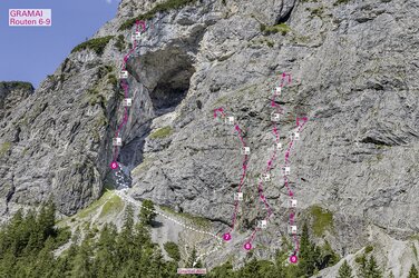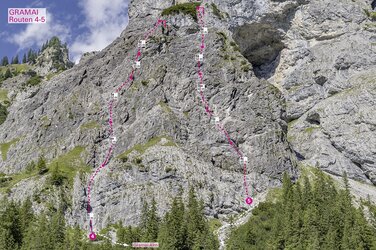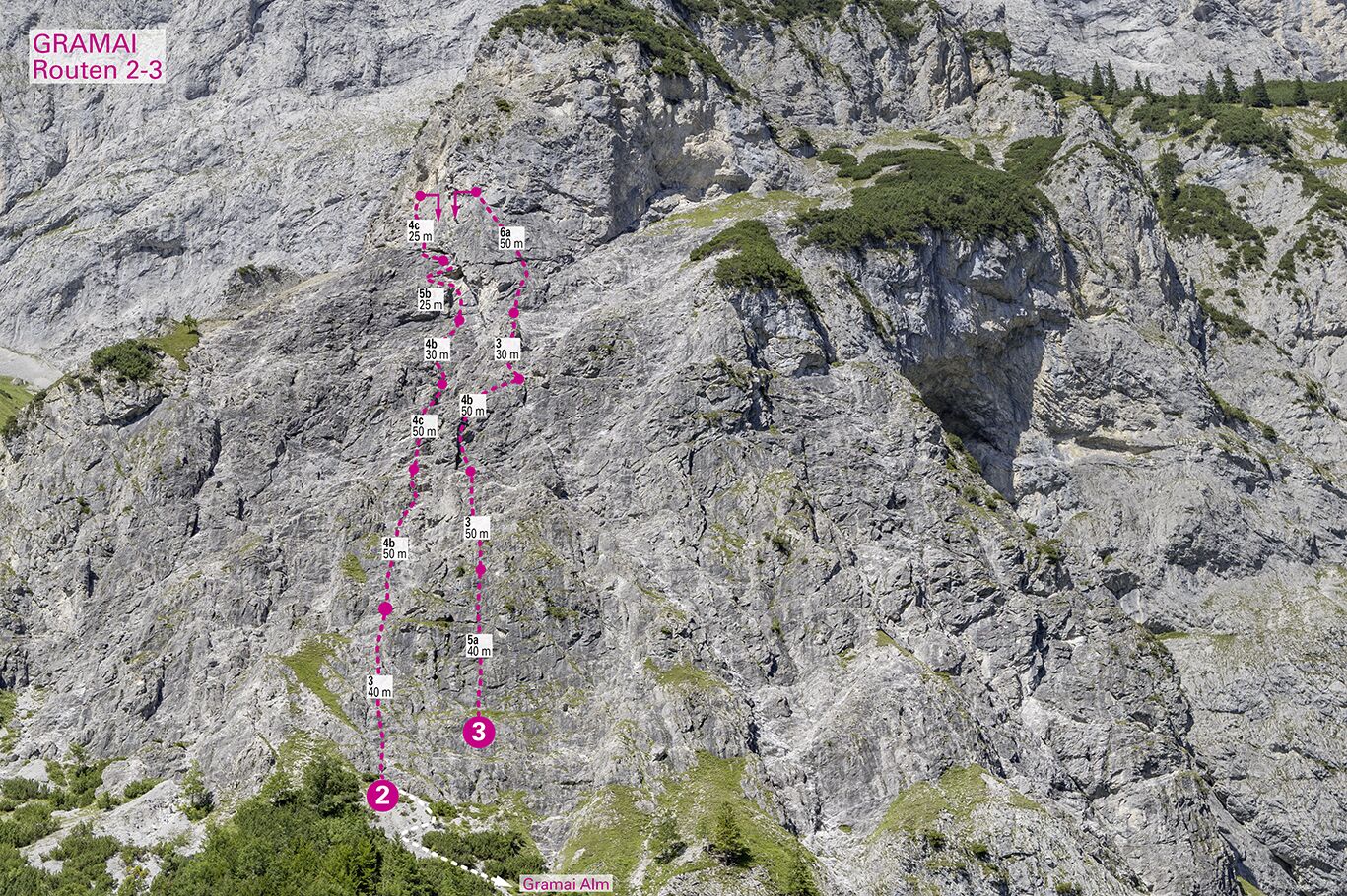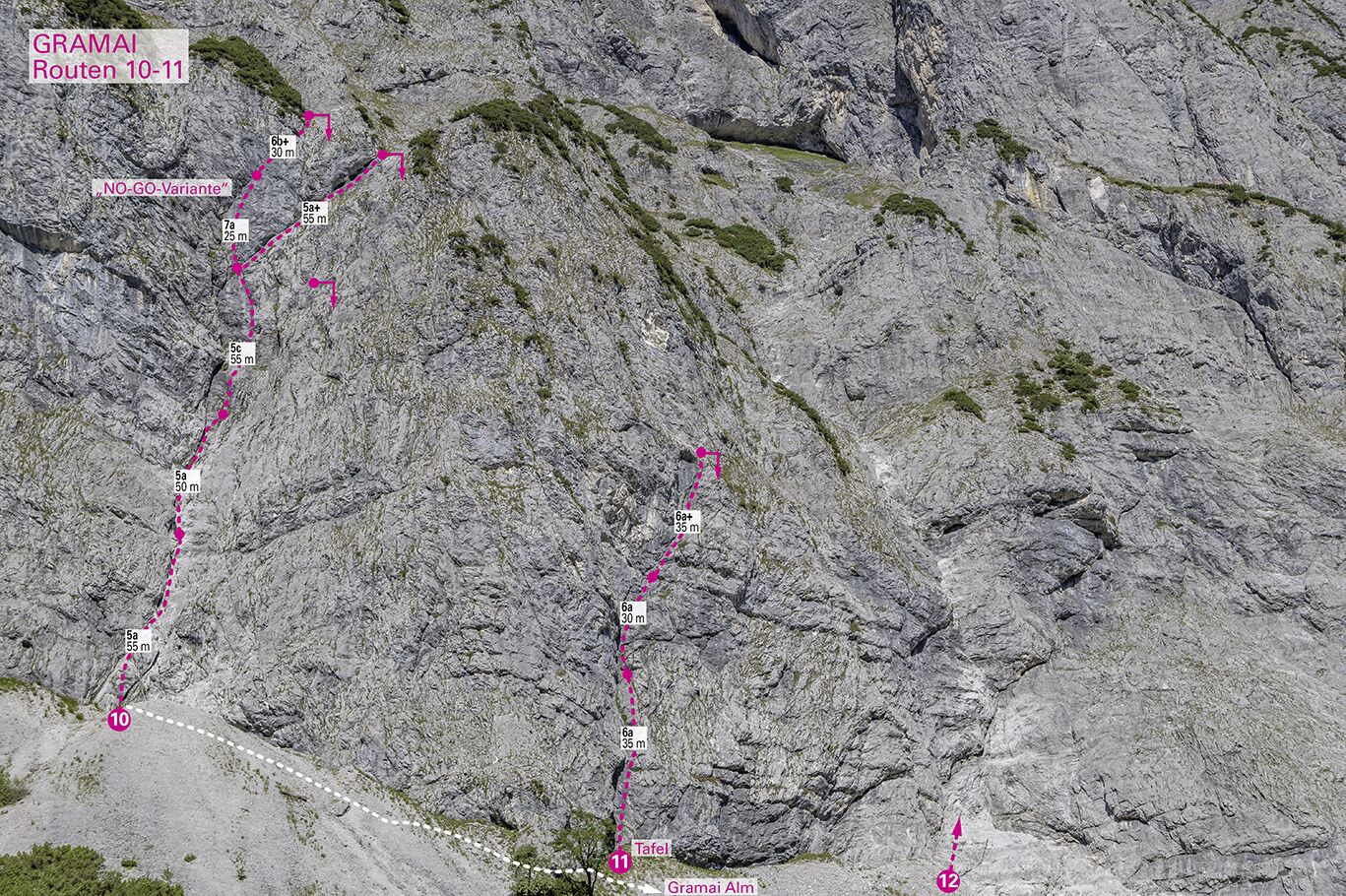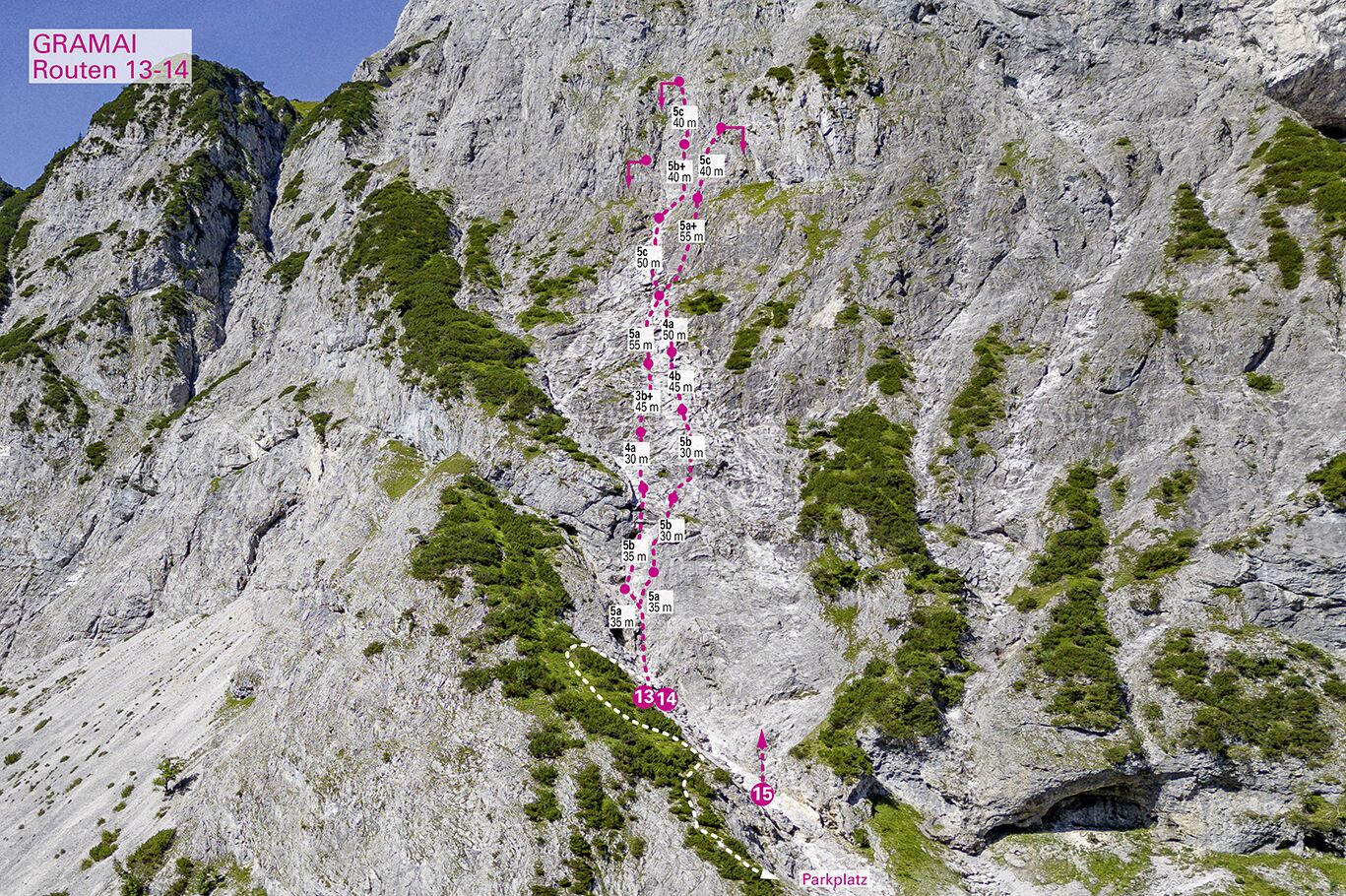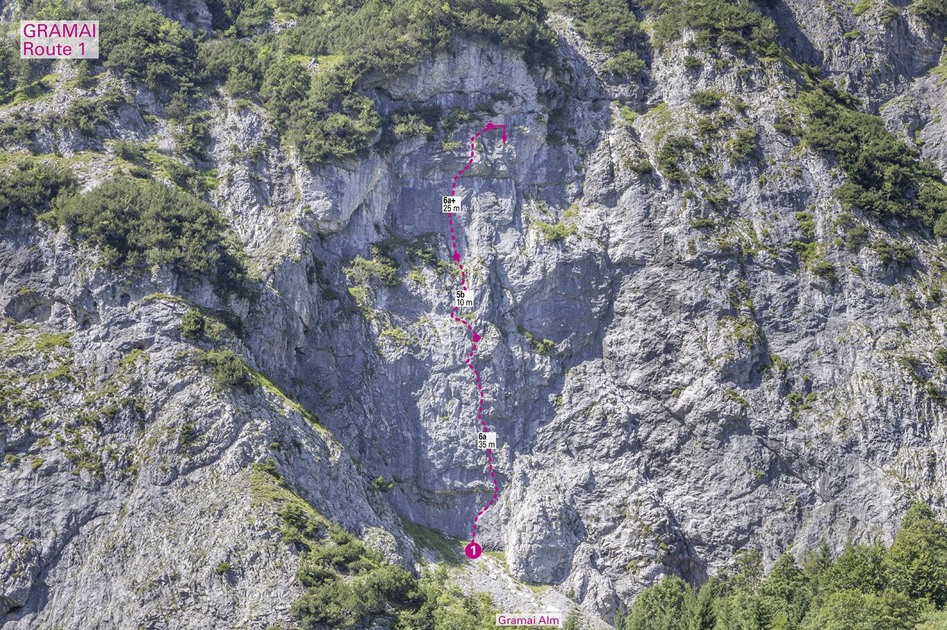 Rechts vom Klettergarten Gramai-Ost den Pfadspuren bergwärts in eine kleine Schlucht. Diese hoch bis zu einem markanten Steilaufschwung, wo eine Tafel den Einstieg markiert.