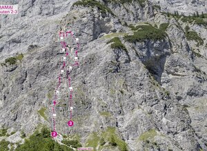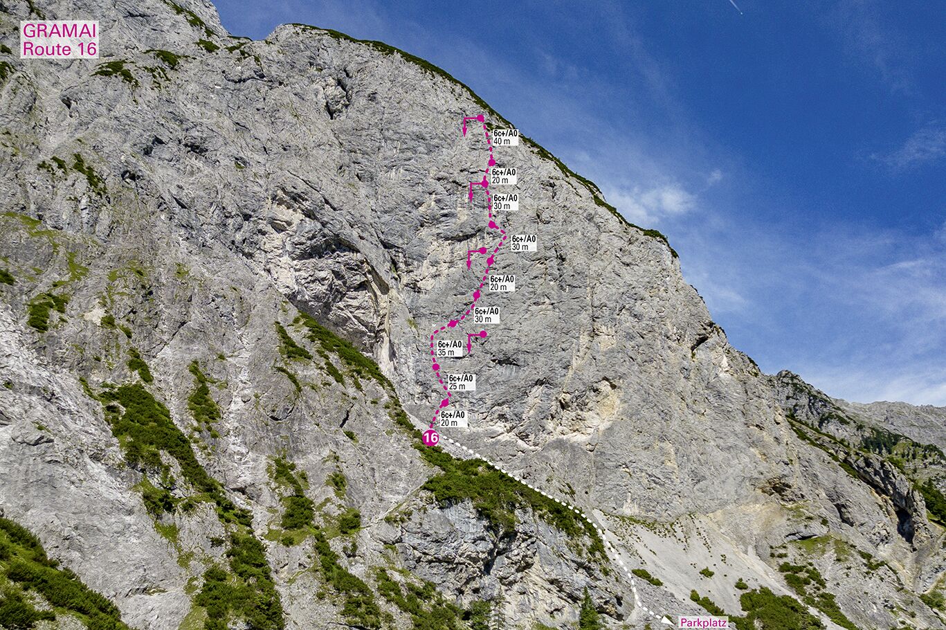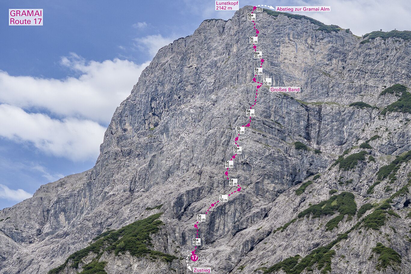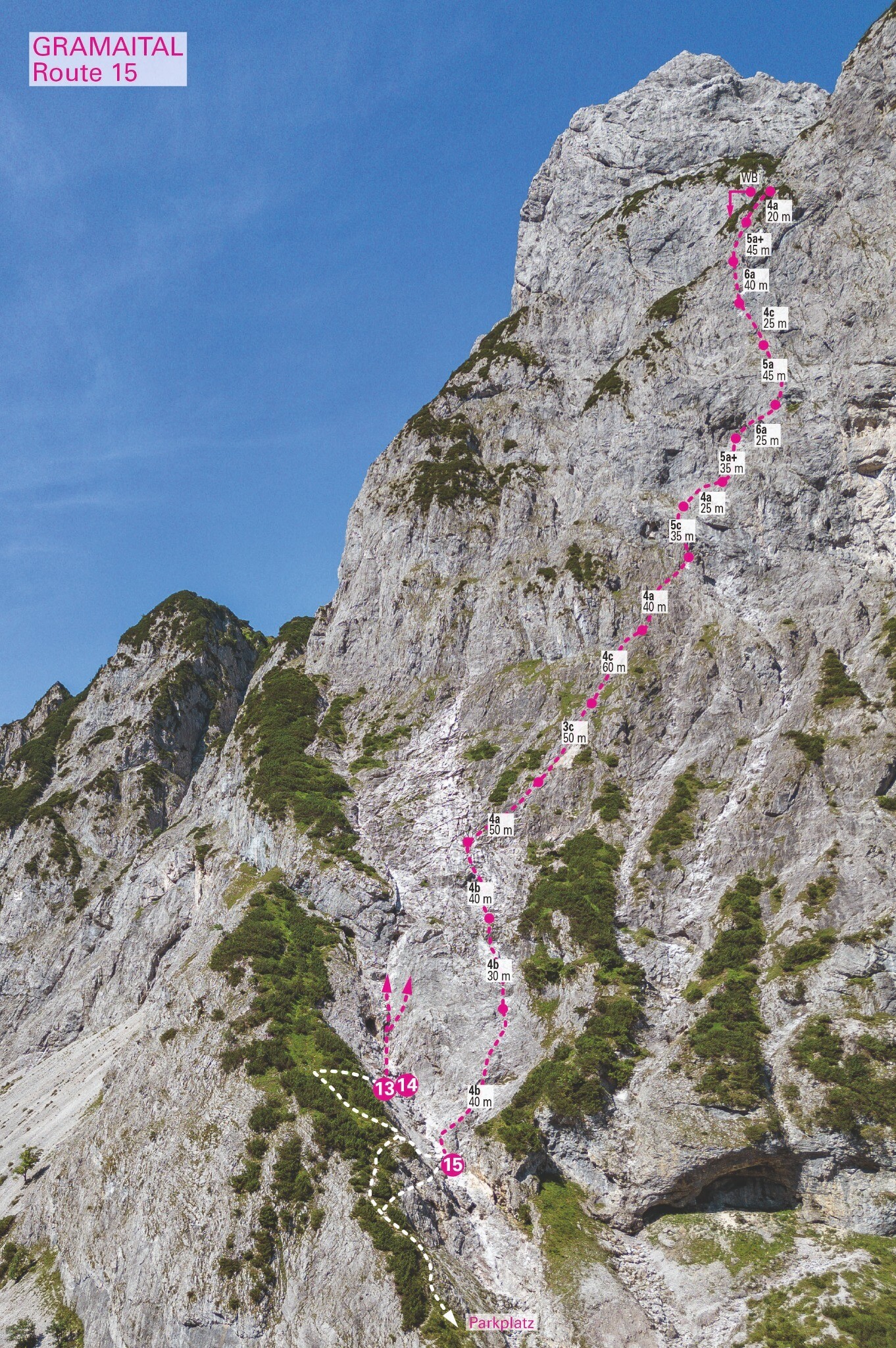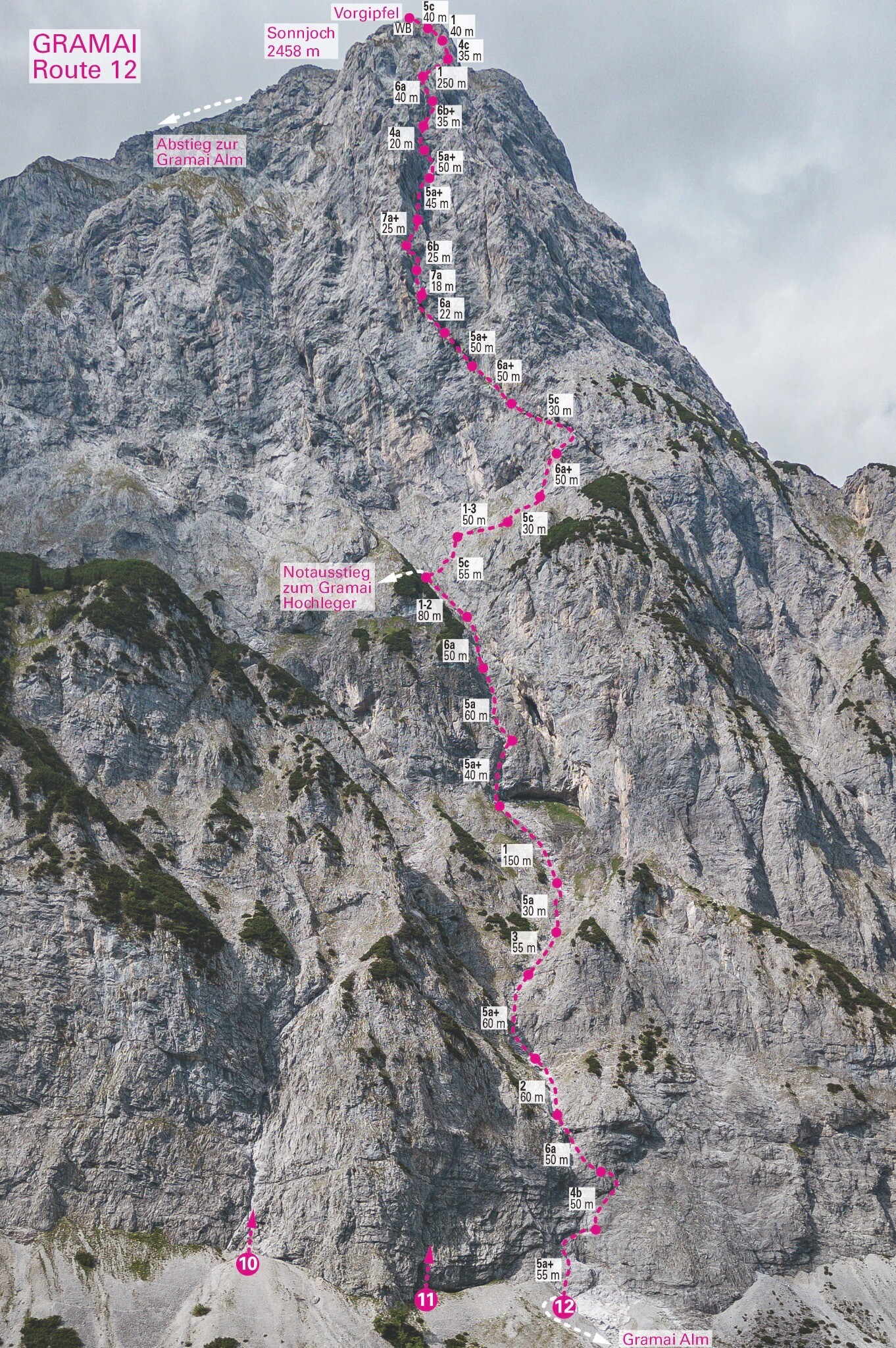 In zwei Stunden vom Gipfel Richtung Westen auf dem markierten Normalweg über den Gramai Hochleger zurück zur Gramai Alm. Notausstieg: Nach der 11., 12. und 13. SL möglich. Entlang der roten Pfeile unter der Hauptwand zum Gramai Hochleger queren (zwei Gegenanstiege). Bei starkem Regen bündeln sich die Wassermassen in den Zustiegsrinnen. Fluchtgedanken dann also nach oben auf den Notausstieg richten.