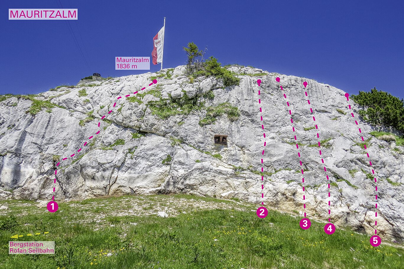 Kleines Übungsmassiv knapp unterhalb der Mauritzalm im Rofangebirge. Die fünf kurzen ca. 8 Meter hohen Kraxeleien im 3. und 4. Schwierigkeitsgrad eignen sich besonders gut für Kinder, Anfänger und Seiltechniktraining.